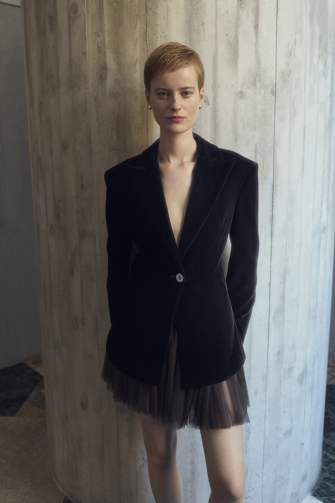 L’intera collezione è caratterizzata da una sartorialità pulita e vivace che può sembrare semplice, ma ogni dettaglio è realizzato con cura dalle mani di artigiani e modelliste, raggiungendo un delicato equilibrio tra comfort ed eleganza attraverso un’esplorazione interiore. Le palette di colori ricordano il blu cielo notturno, il rosa e il verde pistacchio, che danno vivacità della collezione. Velluti italiani, seta, raso e lana a doppiata sono stati utilizzati nella collezione per offrire morbidezza e comfort.
