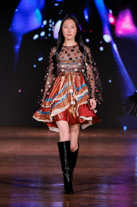 Gli abiti, con il loro spirito romantico, dialogano con la sensualità attraverso delicate trasparenze e una palette di colori vivace. La collezione si presenta come un vocabolario di moda avanzato, celebrando diversità, creatività e libertà personale.