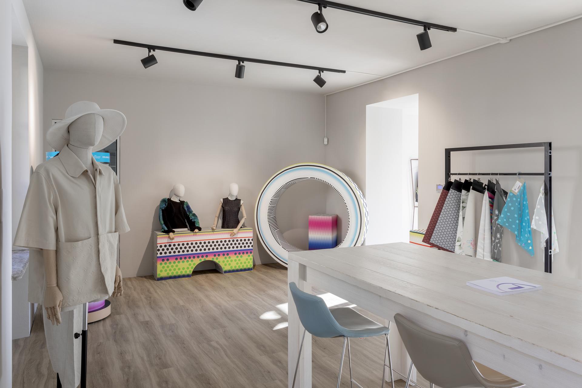 Lo spazio architettonico di Via Lodovico il Moro rispecchia il DNA di D-house e dare un volto ai Partner che fanno parte del laboratorio meneghino. Tra campioni, installazioni, manufatti e macchinari tutto parla di innovazione. Le pareti declinate nel tono accogliente del grigio caldo riprendono una delle nuance della palette che contraddistingue D-house, ripresa anche nei cubi decorativi alternati alle principali tecnologie presenti: dalle stampanti 3D, alla ricamatrice digitale, alle termonastratrici al braccio robotico.