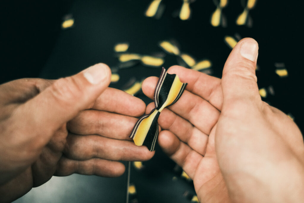 Il progetto, intitolato Pasta Confidences, fonde artigianalità, scienza e design: cacao, spirulina, curcuma, paprika e altri ingredienti naturali diventano pigmenti per creare texture e sfumature ispirate ai tessuti storici di Mantero, in particolare alla prestigiosa collana Staron & Fils, con filati metallici e jacquard risalenti tra il 1928 e il 1972.