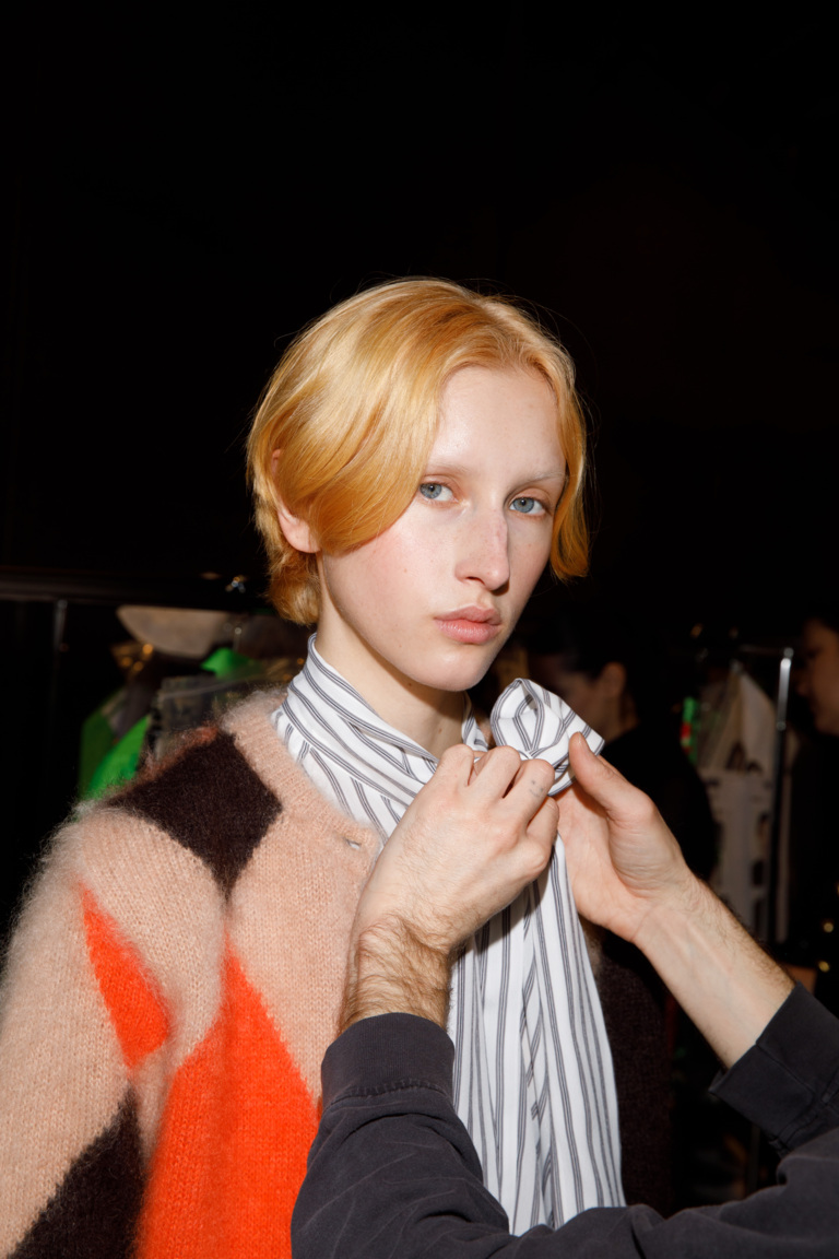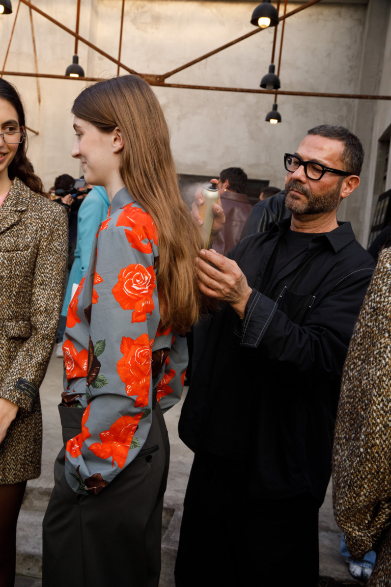 “Per MSGM abbiamo immaginato capelli naturali ma con una texture vissuta, attraversata da leggere irregolarità volutamente controllate. Le texture sono materiche, con un effetto finito–non finito che accompagna l’abito senza sovrastarlo: i capelli diventano un’estensione del look”, racconta Diodovich.