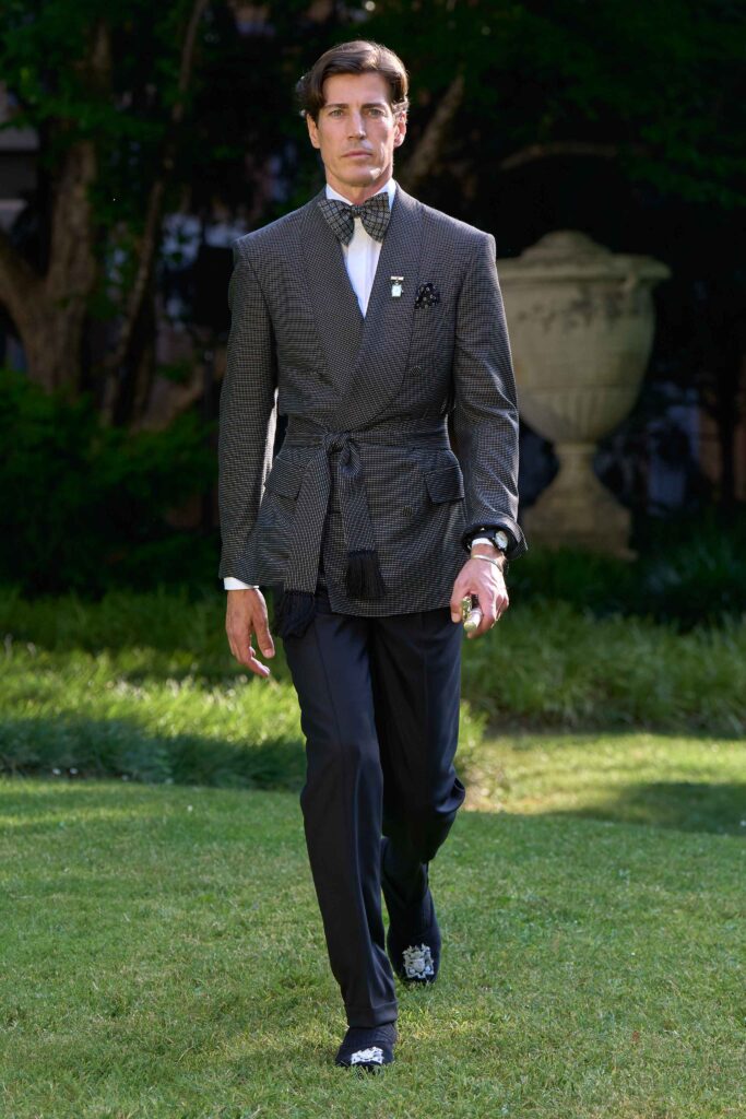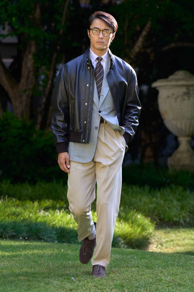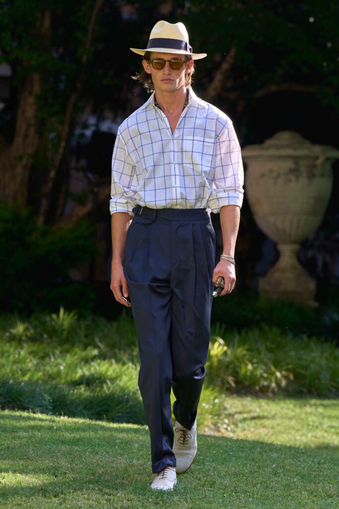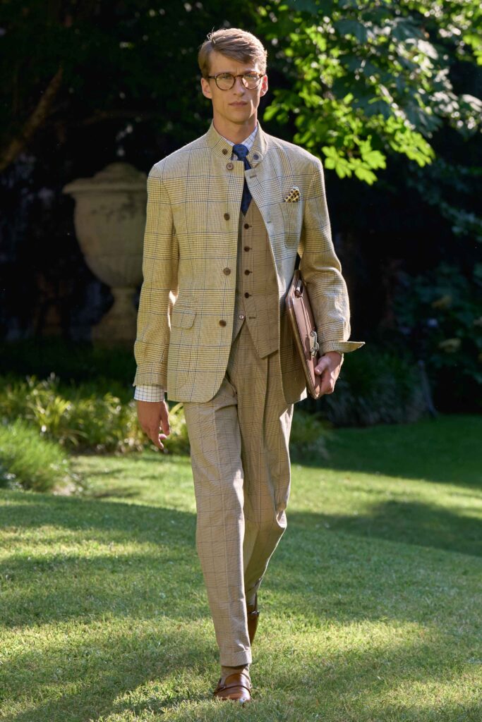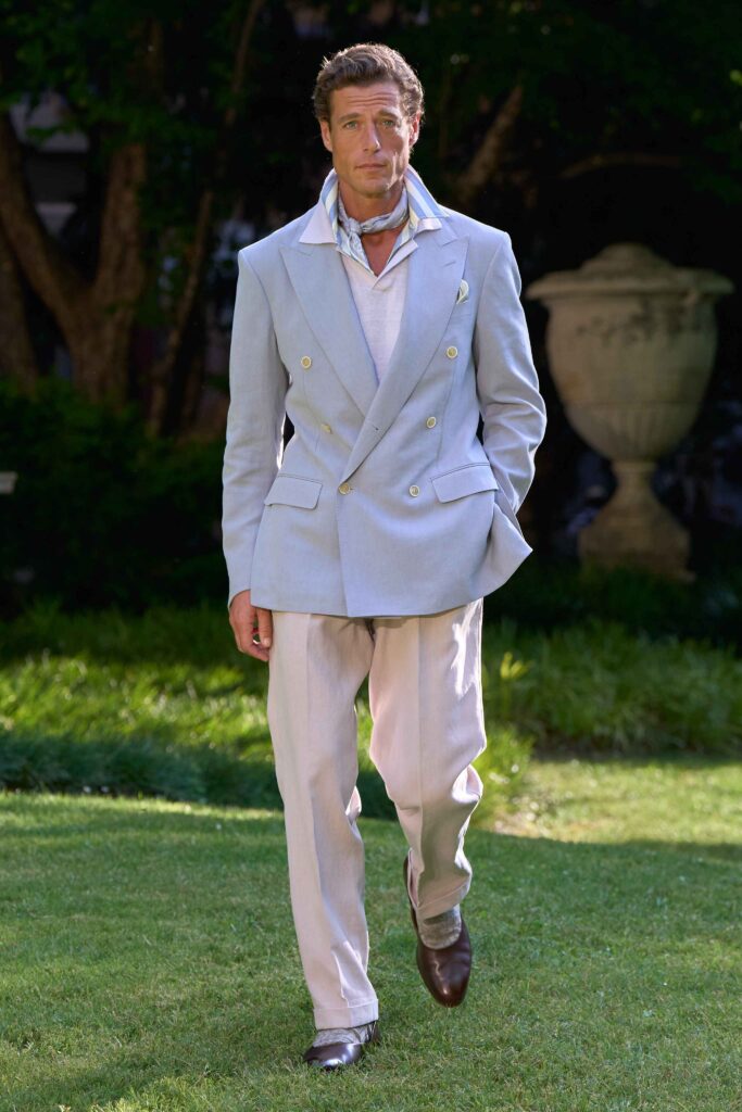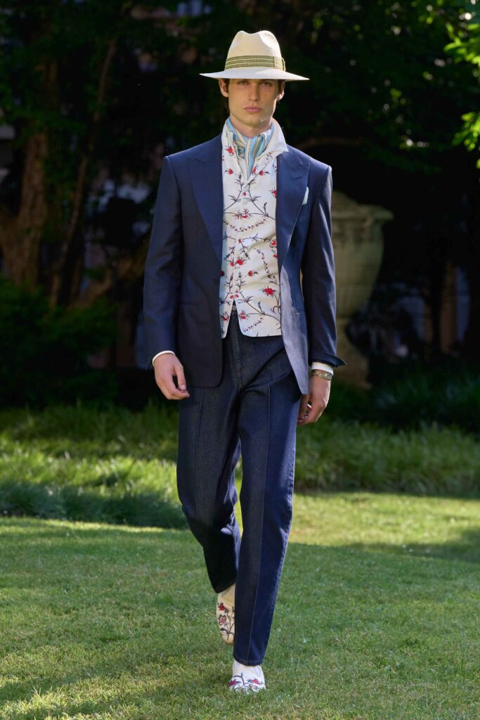Di pari passo con il crescendo del colore, anche l’atmosfera cambia, tingendosi di eleganza sportiva. Cravatte a righe dall’audace personalità si abbinano a giacche Madras dai toni accesi, mentre blazer estivi dall’estetica accattivante richiamano lo splendore grafico della stagione estiva e della sua mondanità. Dall’Alfred Dunhill Padel Classic a Wimbledon e al Chelsea Flower Show: questa è l’eleganza inglese nella sua versione più espressiva. I lini sartoriali sbiancati dal sole sfumano in tonalità neo-Gatsby, come la lavanda slavata abbinata a un rosa robbia tenue. Al loro fianco, i più raffinati chambray indaco, camosci, seta di lino e lino handkerchief a righe. Drappeggiati con morbidezza e al tempo stesso precisione, fanno cenno al piacere più che all’etichetta. L’eccentricità ponderata dell’abbigliamento inglese agli eventi estivi è celebrata attraverso una vera e propria espressione bucolica. I blazer in lino, in un sussurro di toni tenui, sono abbinati a eccentriche righe Regency e gilet con stampe floreali ispirati al XVIII secolo, il tutto abbinato a denim giapponese tono su tono, cappelli Panama e slipper. Le giacche da smoking, caratterizzate da pattern oversize emblematici dell’abbigliamento maschile, sono realizzate in morbidi tessuti misti seta-lana, trasformando i codici tessili classici in un sogno art déco.