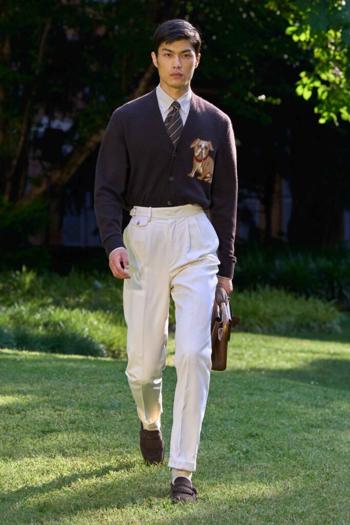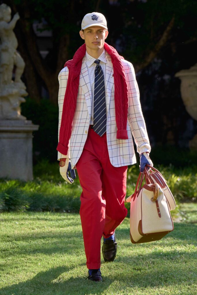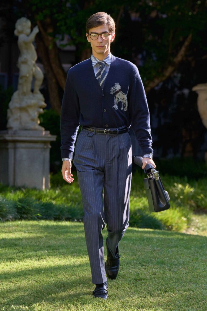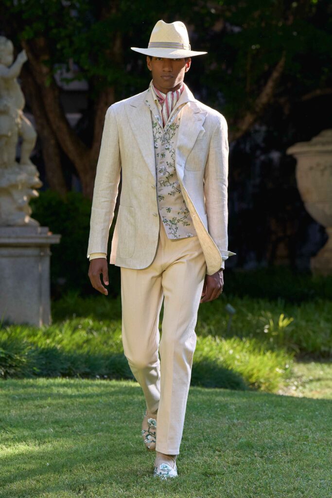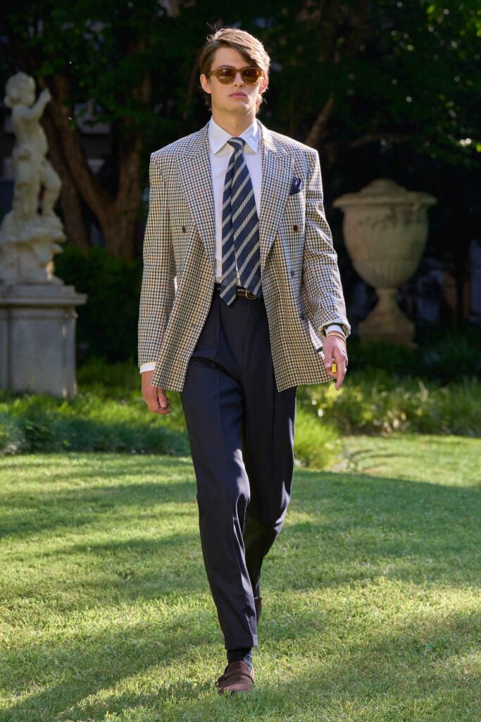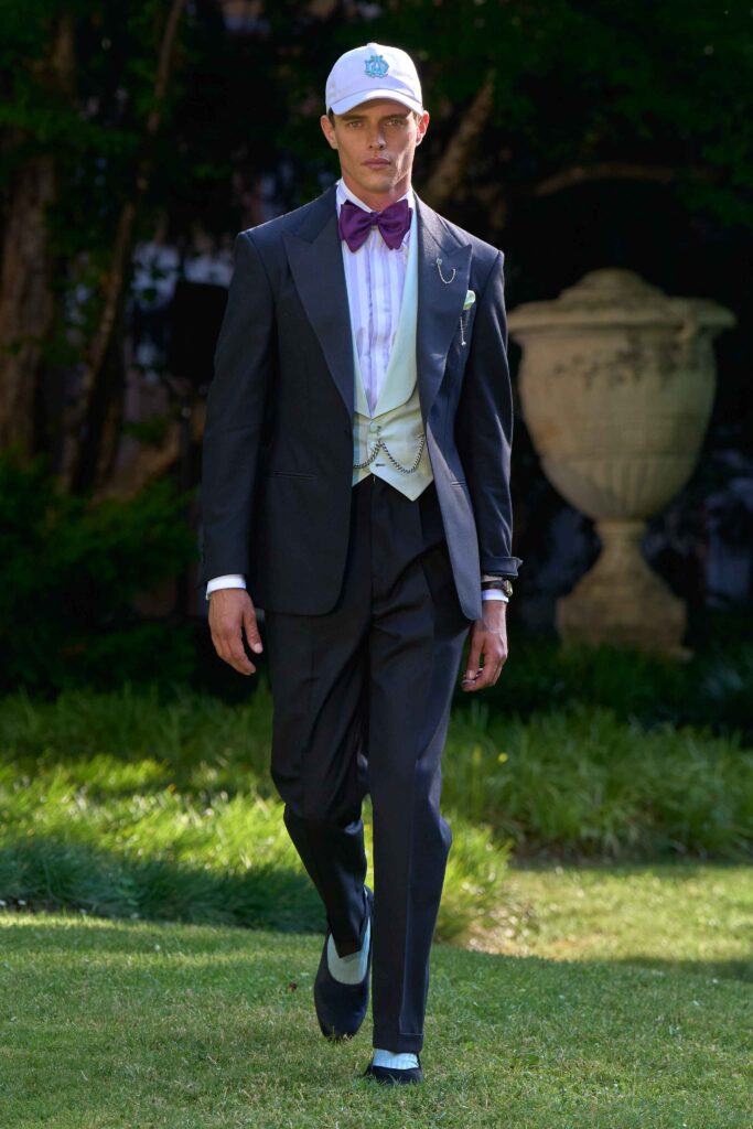 Di pari passo con il crescendo del colore, anche l’atmosfera cambia, tingendosi di eleganza sportiva. Cravatte a righe dall’audace personalità si abbinano a giacche Madras dai toni accesi, mentre blazer estivi dall’estetica accattivante richiamano lo splendore grafico della stagione estiva e della sua mondanità. Dall’Alfred Dunhill Padel Classic a Wimbledon e al Chelsea Flower Show: questa è l’eleganza inglese nella sua versione più espressiva. I lini sartoriali sbiancati dal sole sfumano in tonalità neo-Gatsby, come la lavanda slavata abbinata a un rosa robbia tenue. Al loro fianco, i più raffinati chambray indaco, camosci, seta di lino e lino handkerchief a righe. Drappeggiati con morbidezza e al tempo stesso precisione, fanno cenno al piacere più che all’etichetta. L’eccentricità ponderata dell’abbigliamento inglese agli eventi estivi è celebrata attraverso una vera e propria espressione bucolica. I blazer in lino, in un sussurro di toni tenui, sono abbinati a eccentriche righe Regency e gilet con stampe floreali ispirati al XVIII secolo, il tutto abbinato a denim giapponese tono su tono, cappelli Panama e slipper. Le giacche da smoking, caratterizzate da pattern oversize emblematici dell’abbigliamento maschile, sono realizzate in morbidi tessuti misti seta-lana, trasformando i codici tessili classici in un sogno art déco.