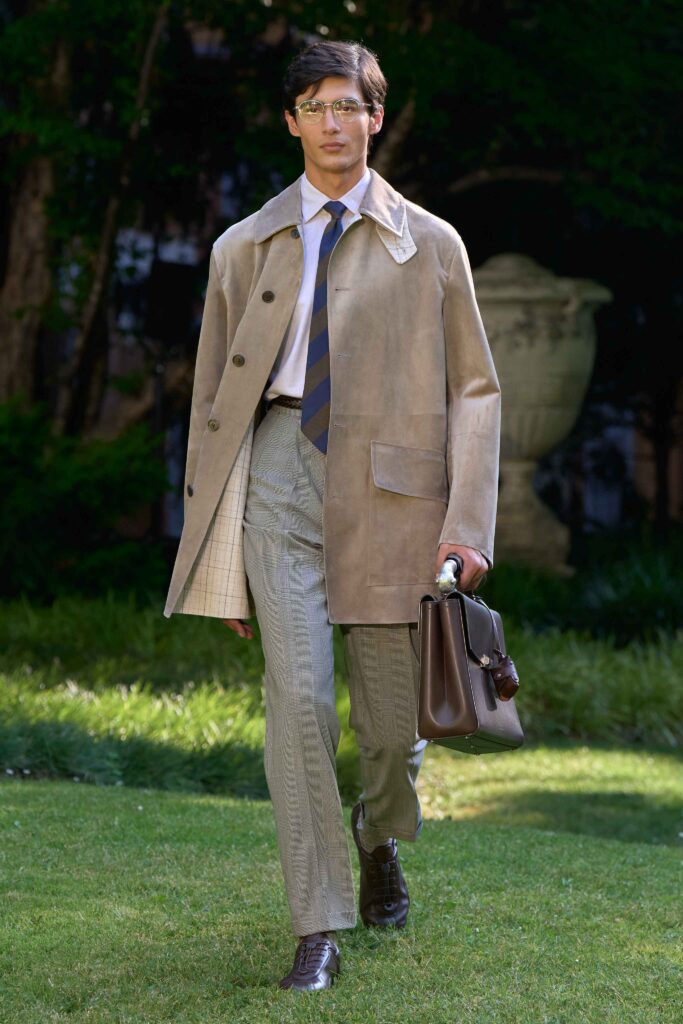 Durante la stagione, la collezione si sviluppa attraverso capitoli diversi: car-coat, blazer driver e trench motoring – ispirati all’eredità Motorities della Maison – sono realizzati in morbidissima pelle d’agnello francese, suede elastico, lino spalmato o twill di cotone e seta in varie tonalità di drab inglese. Le silhouette sartoriali sono strutturate e fluide al tempo stesso, colorandosi di una palette neutra di grigio pietra, greige, drab e blu navy, tipica della Maison. Per quanto riguarda i materiali, invece, sono protagonisti il seersucker, le lane ad alta torsione e il lino filato con tecniche innovative, proposti in tinta unita, quadri oversize e delicati pattern a righe.