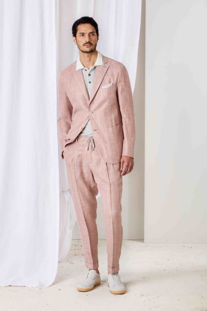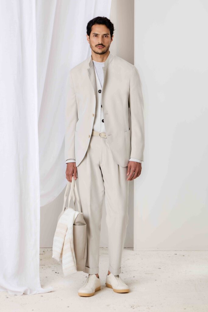 La palette cromatica si ispira all’alba sul mare, con sfumature che spaziano dal giallo coriandolo al rosa cipria, fino al blu di Prussia. Le silhouette sono fluide, i volumi generosi, i dettagli sartoriali – come il colletto “Mao” o le lavorazioni a mano – arricchiscono giacche, camicie e maglieria.