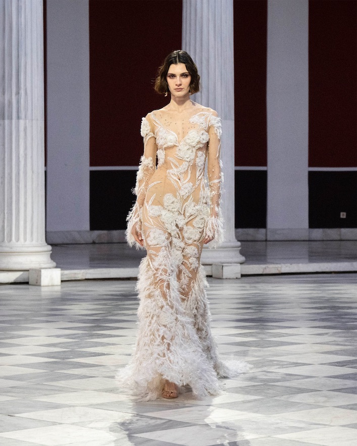 Nella collezione “Eternal,” che presenta anche preziosi capi custom-made appositamente creati per l’occasione, la maestria della designer nel proporre un guardaroba elegante e raffinato per divinità contemporanee, trova la sua massima espressione. La visione sensuale e romantica della femminilità si traduce in ricche lavorazioni di ricami, applicazioni in chiffon, micropaillettes, cristalli e ramage che esaltano all’allure sofisticata di abiti colonna che accarezzano il corpo e miniabiti bustier dalla silhouette scultorea.