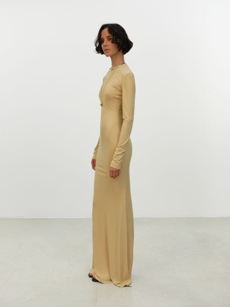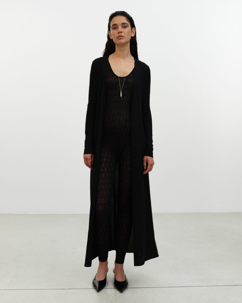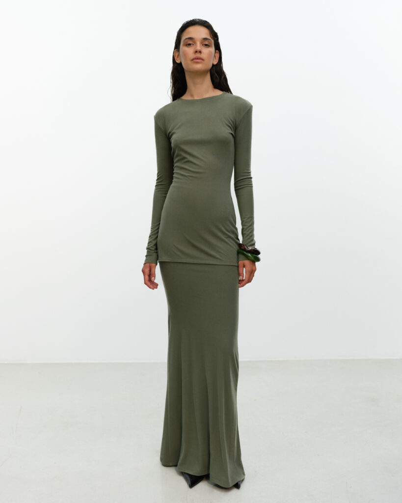 Dalle proposte in lana e cashmere strutturate in sovrapposizioni light perfette per le estati più fresche del Nord, ai modelli in seta inaspettatamente lavorata a maglia, fino alle gonne a tubo abbinate a piccoli top coordinati in macramè, alla serie di mini cardigan, girocollo e V-neck in colori accesi: l’universo knitted è il cuore pulsante delle collezioni di Ely Ely, pur senza mai dominarle completamente. La maglieria si integra con naturalezza al jersey 100% viscosa, sottilissimo ma di alta qualità, e alle nuove proposte in bouclè – novità della PE 2026- in morbide varianti in seta e cashmere che danno forma ad abiti dalle forme vagamente anni ‘60 e ‘70.