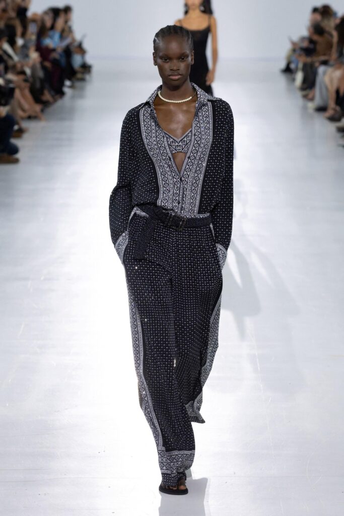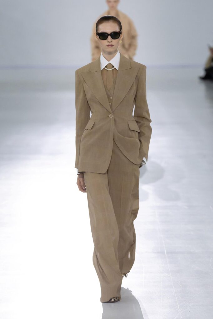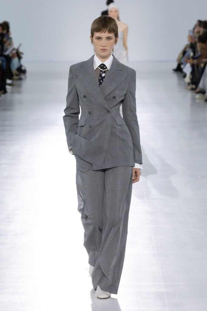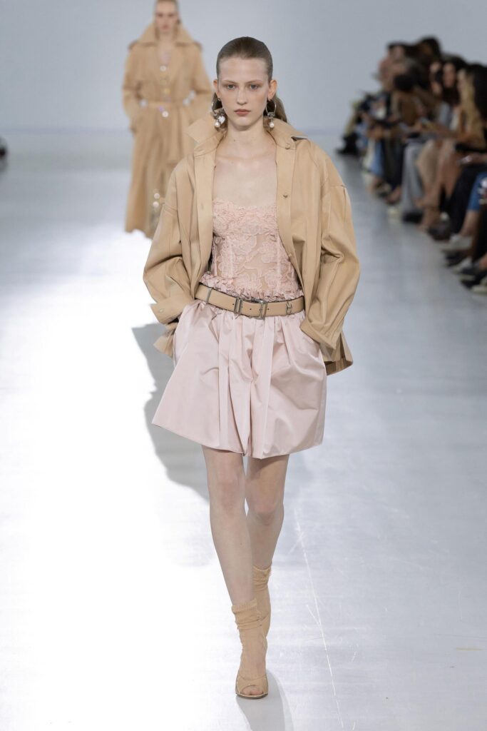 Anche la materia partecipa a questo equilibrio: trova nuove forme grazie alla tecnologia. Lo chiffon, lavorato a strati con un’antica tecnica detta “a petalo d’iris”, conserva la sua leggerezza e trasparenza ma acquisisce una struttura inattesa, fino a diventare un tessuto da blazer. È ancora chiffon, ma è diventato qualcosa che prima non esisteva. Allo stesso modo, la nappa impalpabile e leggerissima plissettata in forme irregolari mantiene la sua lucentezza originaria.