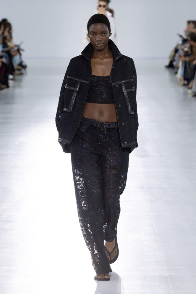 L’atmosfera della collezione è di luce piena e ombra netta, di vuoti importanti quanto i pieni, di superfici aperte alle trasparenze. Il pizzo e l’uncinetto si muovono come garze intrecciate su una terrazza assolata. Le traforature, i disegni a cordoncino, i cristalli applicati in trame geometriche ricordano maioliche, brillanti e irregolari.