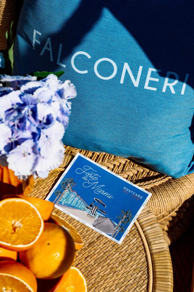 L’apertura ha dato vita a un’esperienza immersiva ispirata allo spirito autentico della costa toscana, celebrando l’eleganza rilassata della villeggiatura estiva. Il set-up, raffinato e suggestivo, ha visto l’uso di colori tenui tra l’azzurro e il celeste, cabine balneari stilizzate, arredi in vimini naturale, limoni e fiori freschi in ceste intrecciate, ombrelloni a righe in cotone e stuoie di yuta che richiamano le passerelle sulla spiaggia. Il patio interno del negozio è stato trasformato in una zona relax dal gusto marinaro e sofisticato, pensata con una palette polverosa che ha combinato le tonalità carta zucchero, corda e avorio, arricchite da righe bianche e dal caratteristico blu baltico, Pantone scelto da Falconeri per mantenere coerenza con la sua identità visiva.