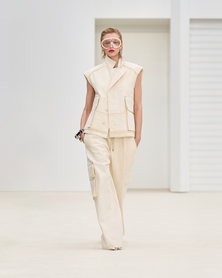 La passerella si fa laboratorio avveniristico: uno spazio bianco in cui la luce e il tatto svelano la fisicità, la rapidità e la libertà di chi indossa i capi. La filosofia è chiara: ridurre per aumentare senso, emozione e connessione.