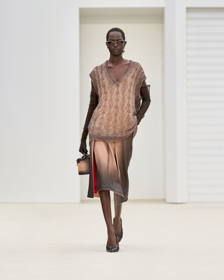 La silhouette è netta, verticale e risoluta. Abiti allungati, ampi volumi sartoriali, camicie fluide e pantaloni cargo introducono la narrazione, seguiti da un intermezzo energico fatto di pelli tamponate, denim acidati e maglieria aerografata. Il percorso si chiude in un bagliore argentato, con fluidità scultoree che esaltano il movimento del corpo.