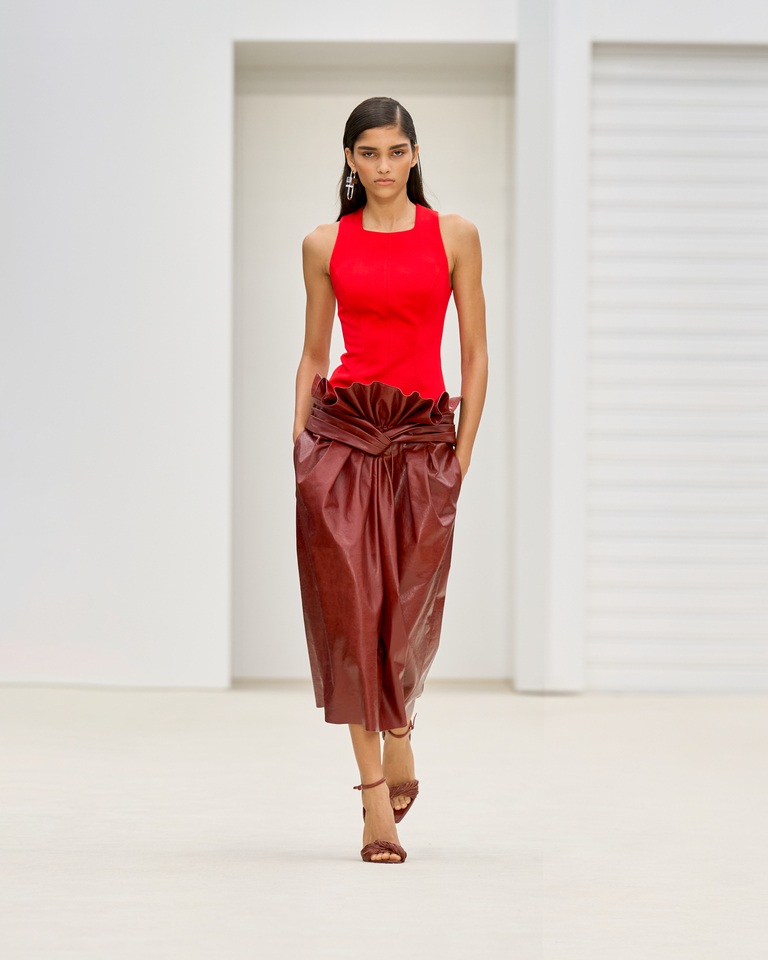 La collezione mette al centro la riduzione come essenza, riportando la moda alla sua missione originaria: dare voce alla materia attraverso la forma. I tessuti – canvas di seta, seta tussah, garza di cashmere, moiré di seta, nappa e denim – raccontano la propria qualità tramite i colori naturali: sfumature di bianco, dal burro all’ottico, ruggine e l’immancabile rosso magma.