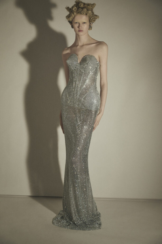 La luce attraversa abiti scultorei in cristallo bianco e nero, sostenuti da corsetterie architettoniche con coppe a cono, espressione di una femminilità forte e controllata. Le tonalità dell’azzurro cielo e dell’aqua bohemica animano un abito impalpabile in tulle ricamato di cristalli dall’effetto liquido, protetto da un macro-giacchino in pelliccia verde menta.