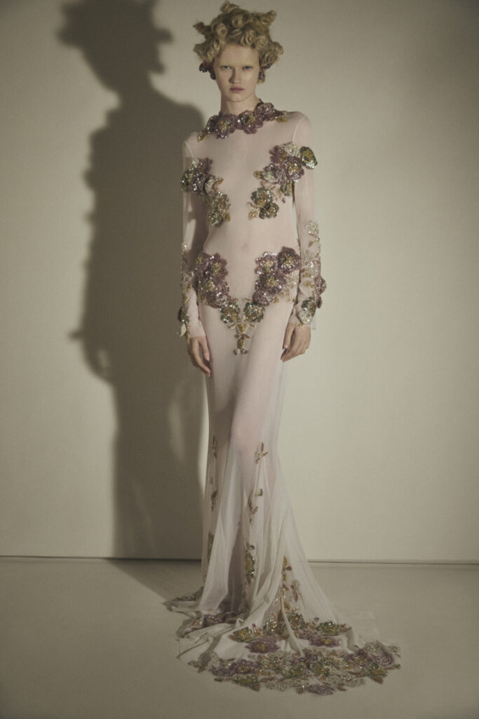 La materia diventa viva attraverso superfici di bouillonné, sulle quali emerge l’immagine di un Cristo argentato, fulcro simbolico della collezione. L’iconografia sacra ritorna ricamata e incrostata, racchiusa in una cornice barocca che definisce una lunga tunica in chiffon bianco, dove purezza e rigore formale si incontrano.