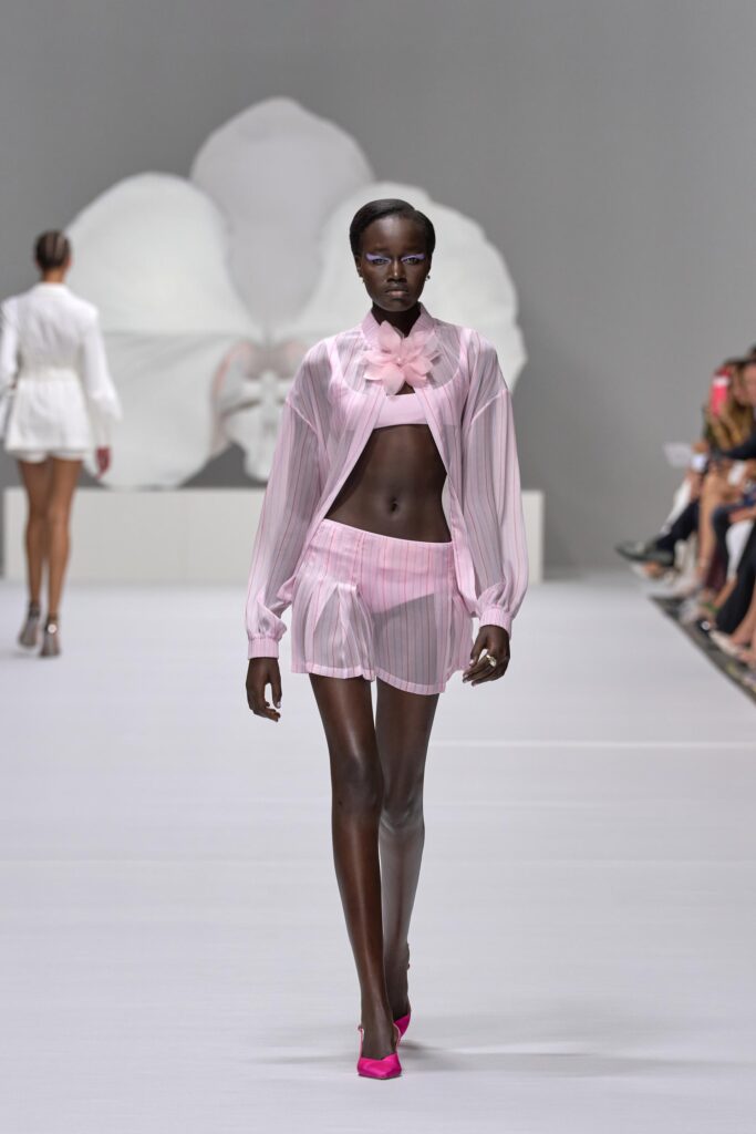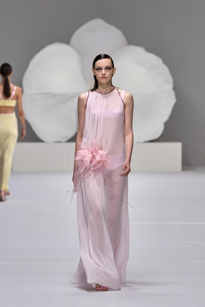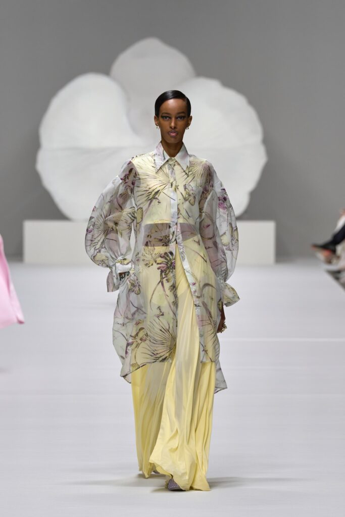 In questo spazio onirico e metafisico sbocciano colori e trasparenze che rendono romantica e al tempo stesso concreta l’intera collezione, mentre l’orchidea, fiore-simbolo della Maison, sboccia su stampe macro e micro effetto pois sul trench in cotone oppure macro sull’impalpabile twill di seta delle bluse da giorno e gonne plissè. Trasformata in bottone-gioiello e in dettaglio ornamentale sugli accessori, l’orchidea verrà celebrata sul catwalk con la magnifica scultura “Geography Desire” in bronzo dipinto, di Marc Quinn.