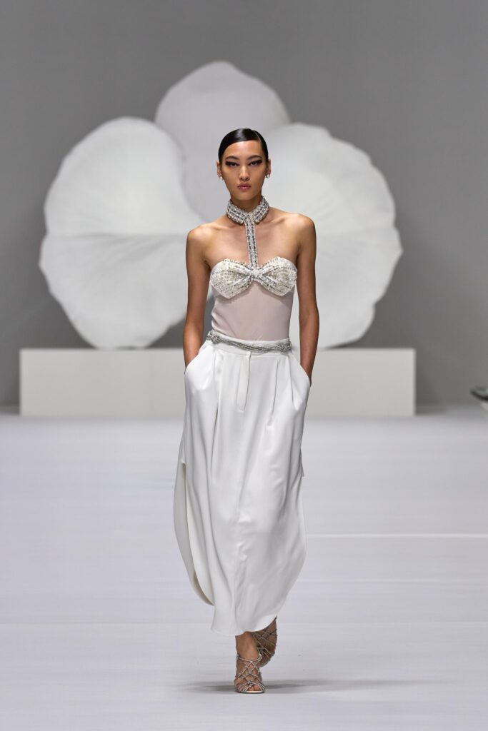Il tema della lingerie serpeggia anche negli abiti da sera in cui compaiono reggiseni a fiocco, corsetti che disegnano il corpo abbelliti di fiori ricamati e motivi a rouge; tessuti e colori rimandano ai fiori onirici di Bosch. Da qui arrivano anche i colori: bianco-mughetto, giallo-girasole, verde-fiore di giada, glicine, peonia, buganivillea e nontiscordardime.