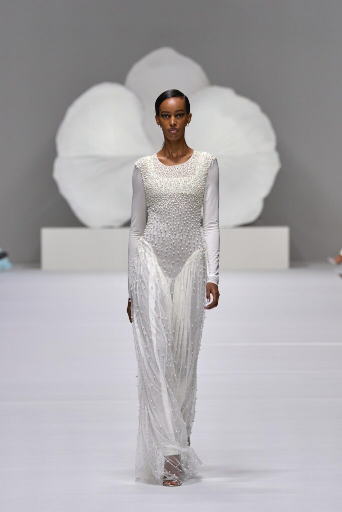 Molto importanti le perle che decorano le bretelle degli evening dress con taglio a canotta oppure disegnano il corpo delle donne come una preziosa pioggia di rugiada sul tulle evasione.