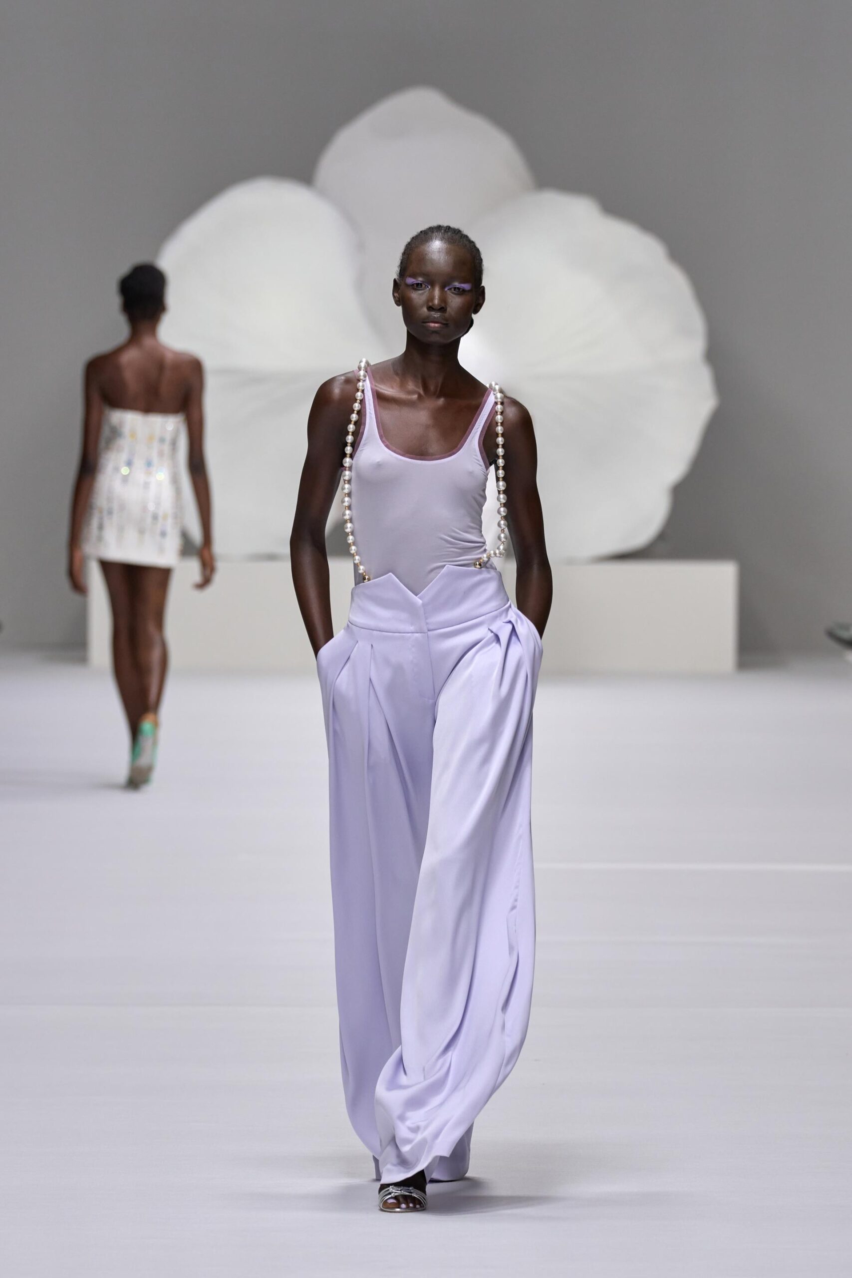 In questo spazio onirico e metafisico sbocciano colori e trasparenze che rendono romantica e al tempo stesso concreta l’intera collezione, mentre l’orchidea, fiore-simbolo della Maison, sboccia su stampe macro e micro effetto pois sul trench in cotone oppure macro sull’impalpabile twill di seta delle bluse da giorno e gonne plissè. Trasformata in bottone-gioiello e in dettaglio ornamentale sugli accessori, l’orchidea verrà celebrata sul catwalk con la magnifica scultura “Geography Desire” in bronzo dipinto, di Marc Quinn.