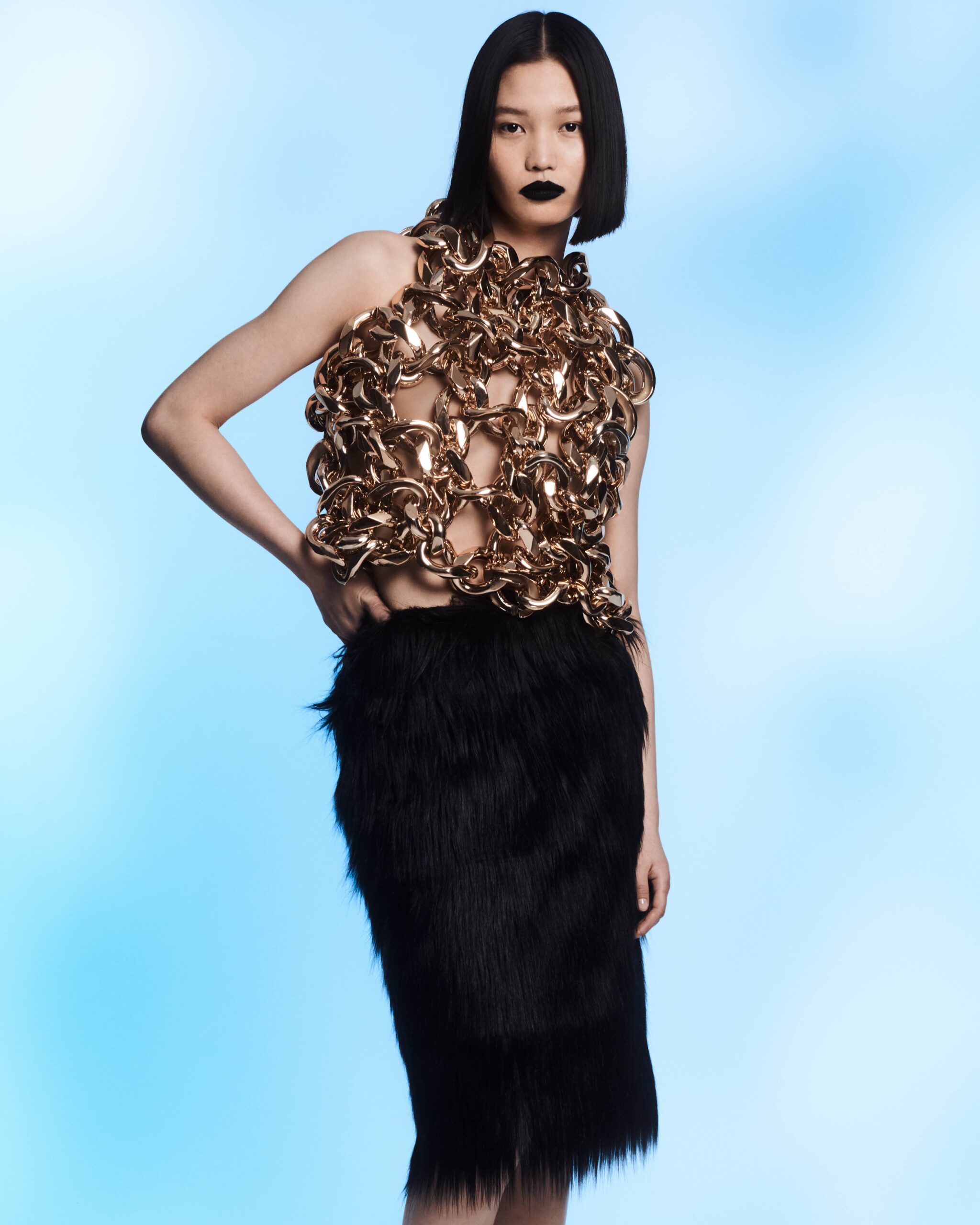 Le giganti catene in plastica riciclata, introdotte sia nei bijoux che nei capi d’abbigliamento, aggiungono un tocco scultoreo e contemporaneo alla collezione.