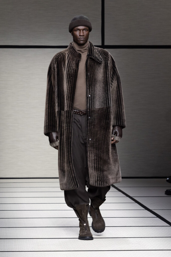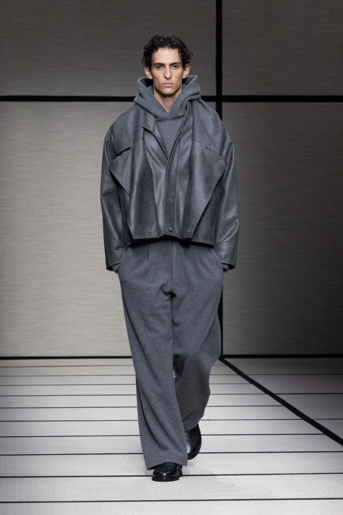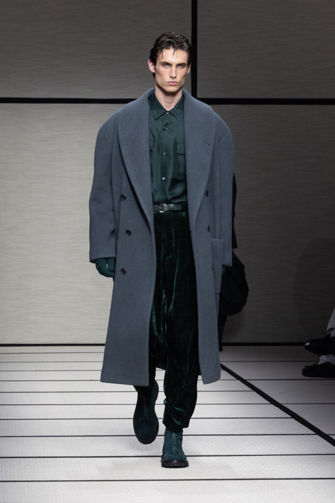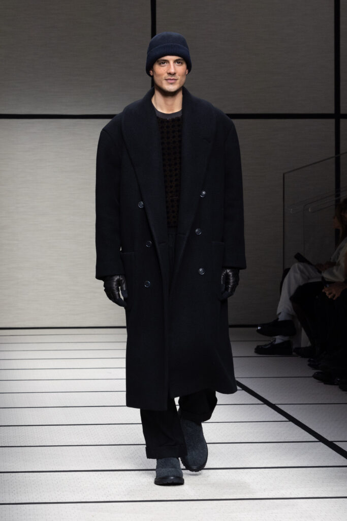 Un atteggiamento disincantato e moderno, che mescola formale e informale, con sicurezza e passione, scandito dalle materie nobili – lane fini, sete e cashmere – e dai colori invernali legati al mondo del sottobosco, con note di grigio che prevalgono e toni preziosi di rosso rubino, verde smeraldo e blu giadeite che tagliano la palette come gemme, oltre al blu pieno e pulito reiterato come segno di uno stile senza tempo. Morbidezza che avvolge: tessuti tattili e tridimensionali, oppure stampati con effetti tweed, e poi montone e pelle. Cappelli, in primo piano, e scarpe che danno sicurezza, accompagnati dalle borse ampie e destrutturate che suggellano l’immagine di un uomo che non ha timore di essere se stesso e di rompere le convenzioni, con gentilezza.