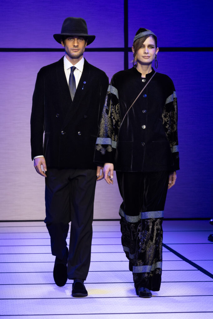 Eleganza da vivere, per vivere l’eleganza senza costrizioni e imposizioni, giocando con la personalità di ciascuno. Vestire Giorgio Armani come esplorazione di possibilità, non come formula preconfezionata. Le silhouette si modificano: i cappotti e i soprabiti si allungano per avvolgere; le giacche, le camicie e i pantaloni cambiano aspetto e diventano più sciolti e confortevoli; gilet zippati dal piglio sportivo finiscono anche sotto il tuxedo.