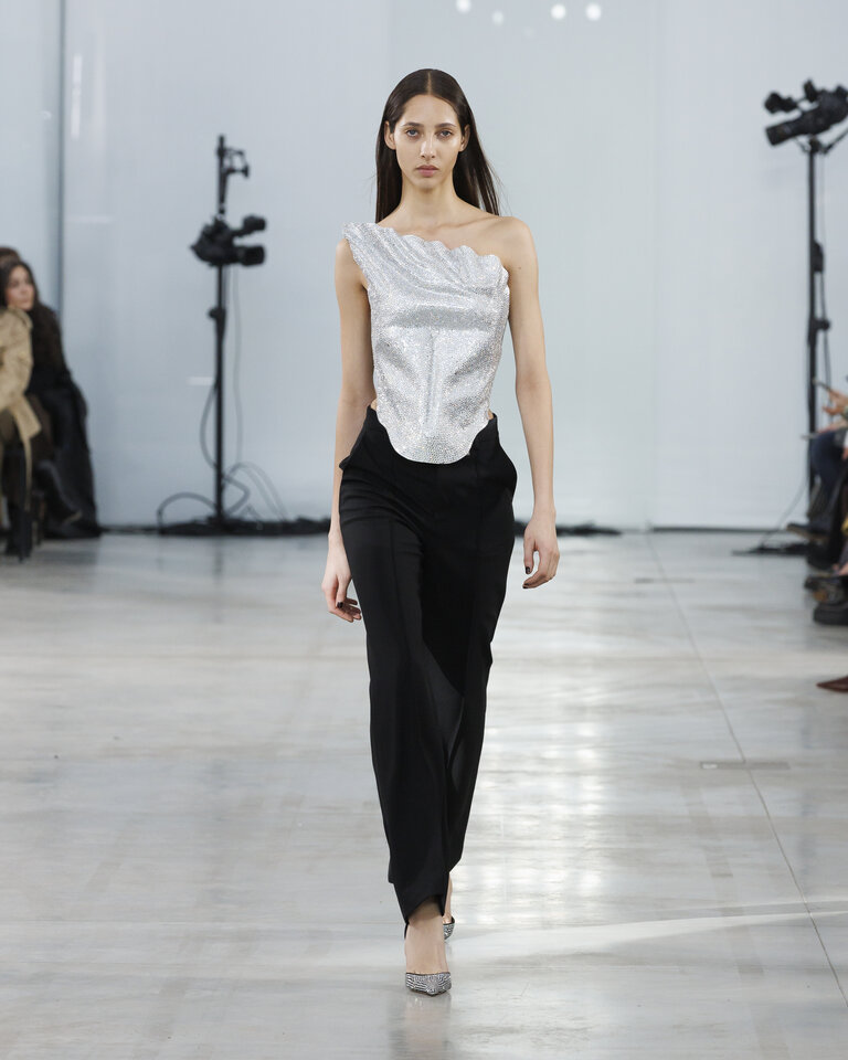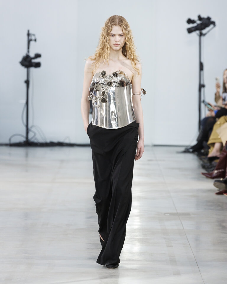 Il tailoring è strutturato, scolpito e deciso, ibridato da inserti di corsetteria e crinoline curvilinee, che evocano abiti di corte sette-ottocenteschi ma vengono interpretate in seducenti miniabiti tempestati di cristalli trasparenti. Armature metalliche sovrapposte a camicie maschili parlano di protezione e resilienza; le rose accennano a delicatezza e vulnerabilità e fragilità; i drappeggi ricordano la sensualità ieratica della statuaria greca; il pizzo allude alla frivolezza venusiana.