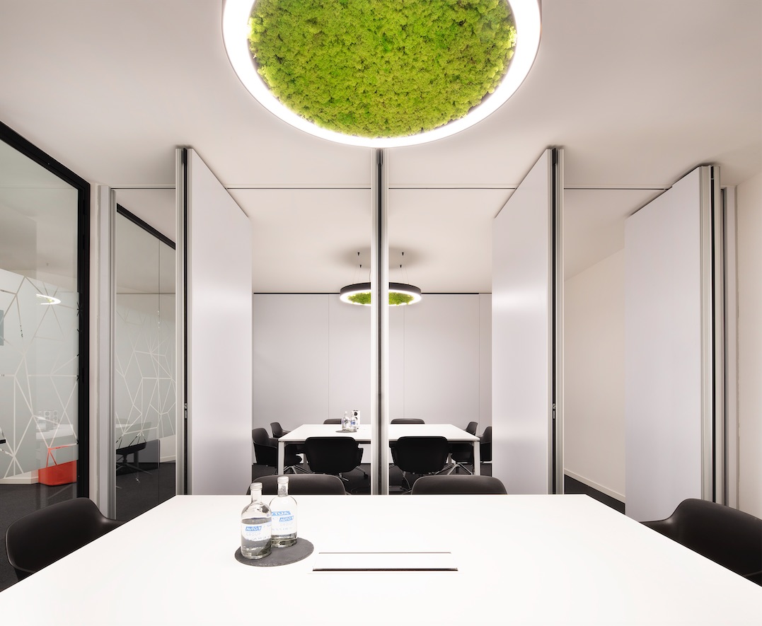 La scelta del colore, caratteristico nei progetti firmati dall’architetto e richiesto dal committente, si è orientata sui toni dell’arancione, che contraddistinguono il logo dell’azienda, bilanciati da tonalità neutre per ambienti a misura di utente. Negli spazi open space, contraddistinti dalla presenza di abbondante luce naturale, sono presenti anche elementi di verde ripresi nei pannelli fonoassorbenti delle illuminazioni nelle sale riunioni. La scelta di utilizzare, poi, pareti divisorie scorrevoli consente di poter convertire facilmente e rapidamente spazi aperti in dedicate sale riunioni.