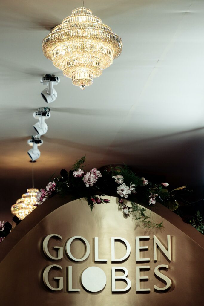 Appesi lungo il nuovo red carpet del Beverly Hilton Hotel di Los Angeles, i lampadari hanno offerto uno sfondo visivo spettacolare, fotografato da star di cinema e televisione all’arrivo dei candidati.