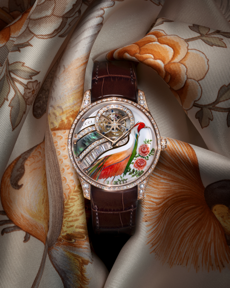 La linea G-Timeless Métiers d’Art si distingue per l’ispirazione ai motivi d’archivio dei foulard in seta, trasformati in vere opere d’arte attraverso tecniche raffinate come micropittura, incisione, smaltatura e intarsio. I quattro modelli, tutti con cassa da 40 mm e cinturino in alligatore, celebrano la natura e il mondo animale con composizioni ricche di dettagli e materiali preziosi. Due di essi vedono la collaborazione della plumassière Nelly Saunier, che impreziosisce i quadranti con delicate piume selezionate e lavorate a mano.
