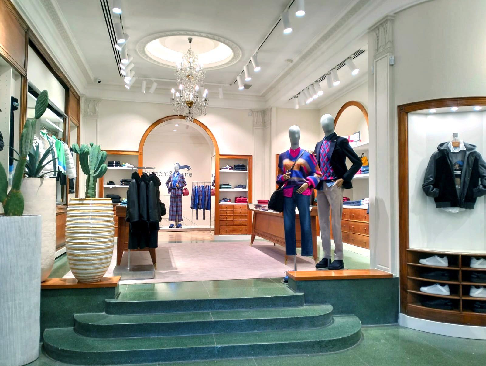 Gli interni della nuova boutique svelano un’atmosfera accogliente e rilassante, caratterizzata dall’uso attento del colore attraverso un percorso fluido e dinamico alla scoperta delle collezioni di abbigliamento e accessori Harmont & Blaine Uomo e Donna. Toni luminosi di bianco e verde, uniti alle superfici in legno e ottone, accompagnano i diversi ambienti arredati con sedute color ocra ed espositori che richiamano le nuance dei fondali marini.