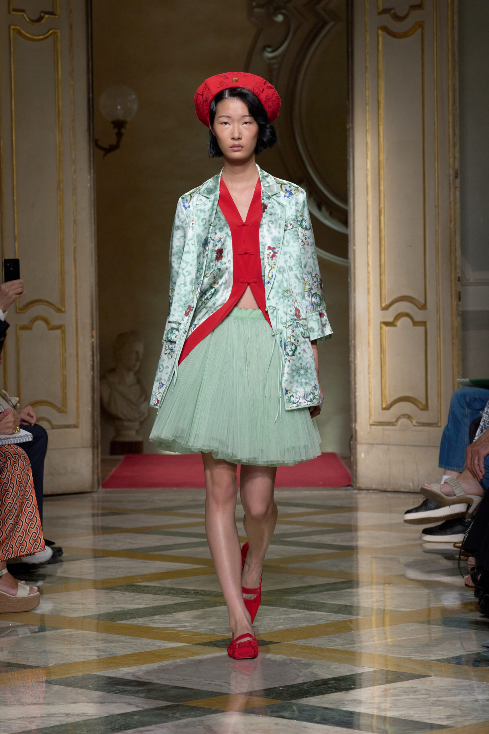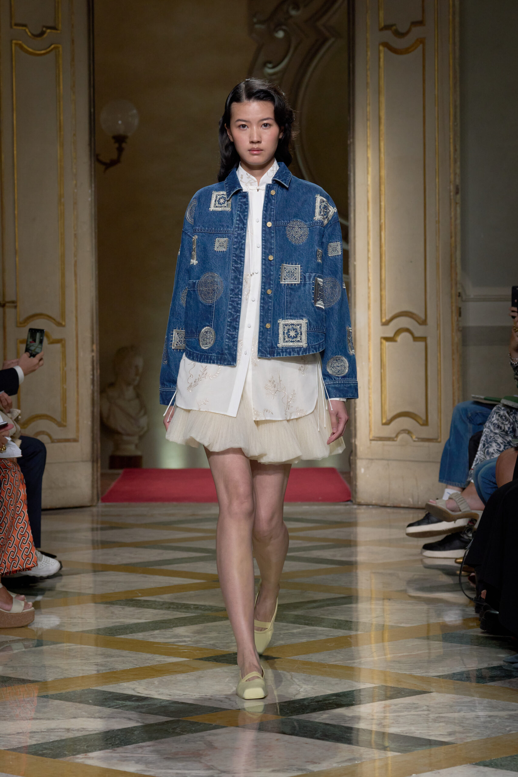 Abbiamo visto molti short da indossare con il kimono, gonne di tulle evanescente sotto al blazer maschile, pratiche salopette scostate dal corpo e piccoli seducenti bustier sopra alle grandi camicie over. La parte in denim della collezione era volutamente coperta dal ricamo a sigilli per celebrare l’incontro tra Oriente e Occidente che è da sempre l’obbiettivo di Hui Zhao. I tessuti erano twill di seta, chiffon, popeline, drill di cotone, tulle e jacquard. La palette si è ingentilita di toni come verde giada, giallo vaniglia, bianco stucco e rosa peonia accostati a rossi vigorosi e azzurri tonici. Per gli accessori maxi shopper, tote bag, piccole borse a mano e scarpe da danzatrice.