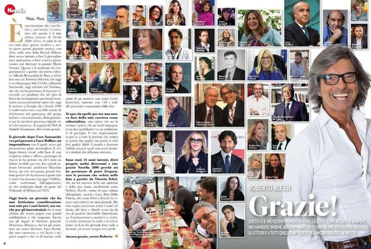 C’è qualcosa di profondamente simbolico nell’addio di Roberto Alessi a Novella 2000. Dopo 14 anni, il suo ultimo editoriale non è solo un saluto, ma il racconto di un ciclo che si chiude con consapevolezza: dai primi passi nella sede Rizzoli Editore fino al lavoro di ricostruzione del giornale, attraversando cambi di proprietà, momenti complessi e rilanci importanti. Nei suoi ringraziamenti, da Alfredo Bernardini De Pace a Federico Silvestri, fino a Daniela Santanchè, emerge una carriera costruita dentro relazioni e trasformazioni continue. Eppure, al di là delle parole ufficiali, si percepisce quel momento preciso in cui qualcosa cambia: “Da aprile io lascio”. Non una rottura, ma una transizione verso un nuovo ruolo da editorialista, che lui stesso definisce impegnativo, quasi vertiginoso. È uno di quei passaggi che raramente arrivano all’improvviso: prima li senti, poi li annunci. I have a feeling, anche qui.