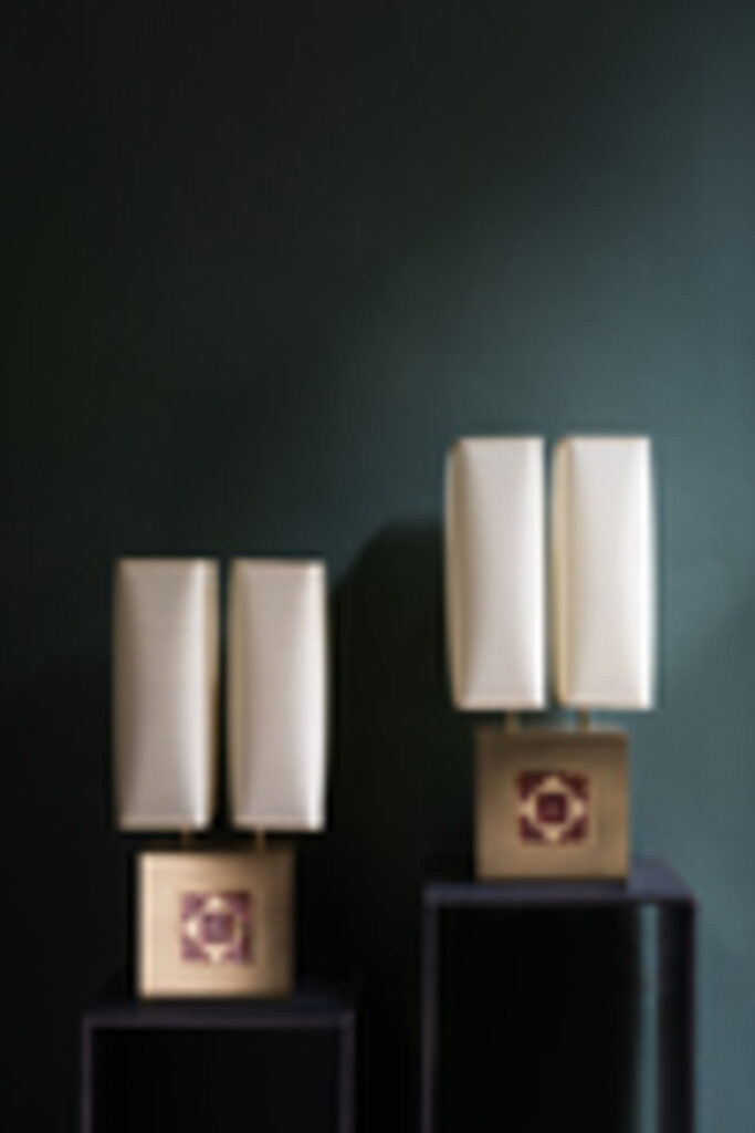La lampada LEI si distingue per la sua struttura essenziale e pulita, declinata in tre varianti di materiali: pergamena, ottobre satinato e ferro brunito. Il punto focale del design è la base cubica, dove un inserto geometrico in smalti cloisonné realizzati a mano cattura l’attenzione.