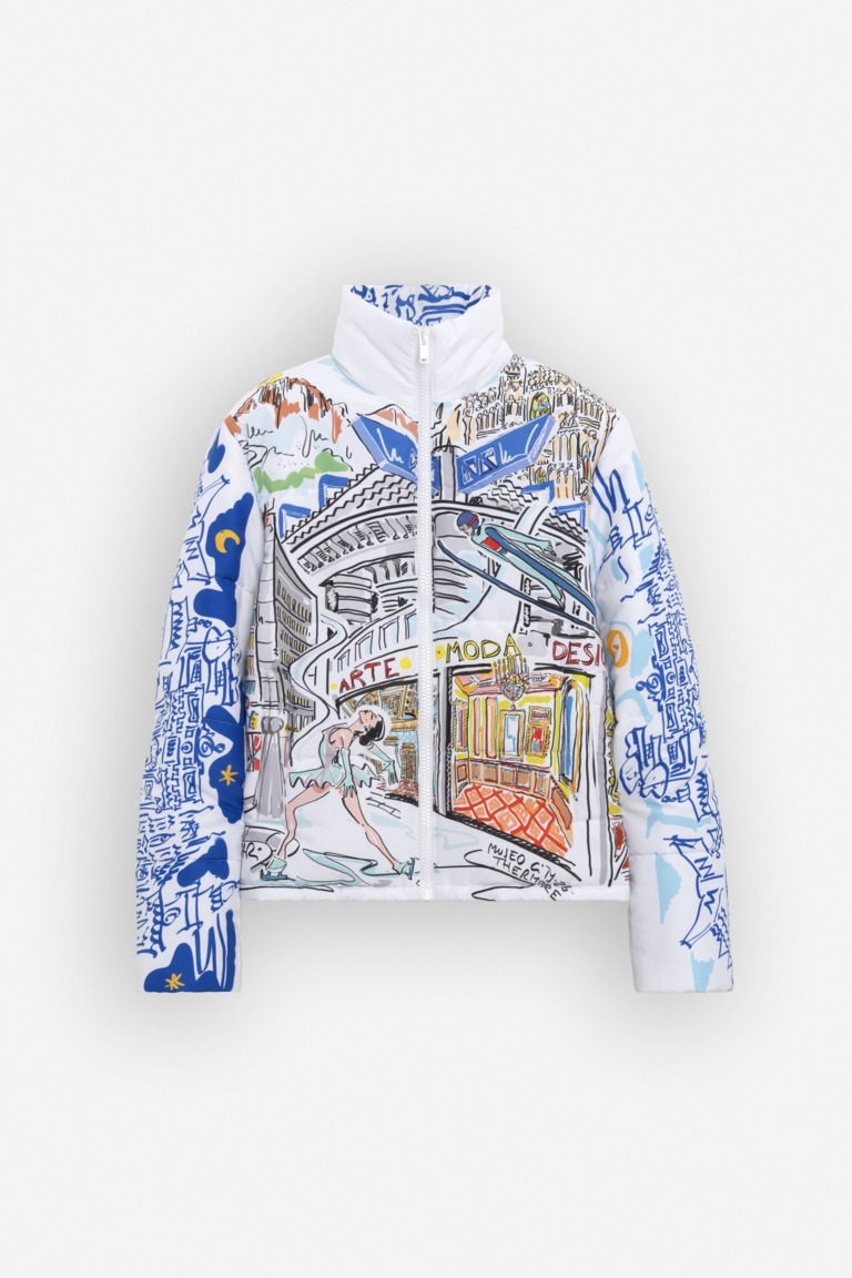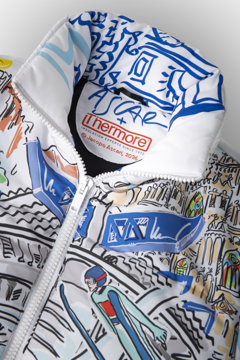 Il progetto si configura come un vero e proprio viaggio visivo che trasforma l’abbigliamento tecnico in narrazione grazie al prezioso tratto di Jacopo Ascari, architetto e illustratore che ha curato l’identità visiva dell’intera manifestazione. Le illustrazioni sul capo fondono iconici simboli urbani, come le guglie del Duomo, con richiami eterei al mondo degli sport invernali e alle vette innevate, creando un ponte ideale tra la metropoli e l’alta quota. La realizzazione è stata affidata a Contrado, brand londinese specializzato nella produzione di capi fashion, realizzati artigianalmente con un modello produttivo integrato che ha permesso di trasferire con precisione la visione creativa dell’artista su un supporto tecnico ad alte prestazioni. “Nelle illustrazioni realizzate, Milano si compone di palchi su cui ogni visitatore può vivere un momento di vivacità e ottimismo,” spiega l’artista Jacopo Ascari. “La storia di Thermore onora la cultura sportiva e d’impresa: la Milano che ho ritratto celebra i sogni che prendono vita e i valori del movimento nella vita quotidiana.”