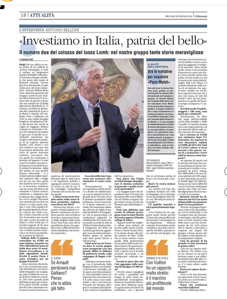 Mentre scrivo sono ancora in corso le sfilate parigine che sempre di più producono bellezza. Le seguo da Milano perchè, da quando non ho più la casa dei miei genitori a Parigi, soggiornare nella Ville Lumiere è diventato proibitivo. Così mi concedo il lusso di stare nella capitale solo ogni tanto, quanto sento la necessità di capire dove sta andando la moda. Al momento, essendo tutto molto chiaro, guardo attraverso gli occhi dei colleghi che sono li. Leggo ad esempio l’articolo di Daniela Fedi su Il Giornale ( qui il link) in cui intervista Antonio Belloni, anzi Toni perchè lui ci tiene molto. Lo so perchè a settembre 2023 gli abbiamo consegnato il premio alla carriera ai CHI E’ CHI FASHION COMMUNITY AWARDS e lui ha insistito tantissimo affinché fosse scritto così il suo nome. Belloni è il numero due del colosso LVMH, gruppo che negli ultimi anni sta investendo sempre di più nel nostro paese, in particolare modo nella filiera produttiva «Arriveremo presto a superare i 15mila addetti e vogliamo continuare ad assumere perché solo in Italia si trovano e si possono formare degli artigiani dalle mani d’oro. Non è per caso che le manifatture fanno da capofila a circa 5.000 aziende fornitrici distribuite sul territorio nazionale». Si, siamo bravi a fare prodotto noi italiani e non a caso borse e scarpe di brand francesi sono prodotte nel vigevanese e asciugamani e biancheria a Busto Arsizio (una mia amica mi faceva avere gli asciugamani di Chanel e Louis Vuitton ….). Ogni distretto ha la sua piccola produzione, per non parlare di Mantero che produce le sete per tutti i gruppi del lusso.
