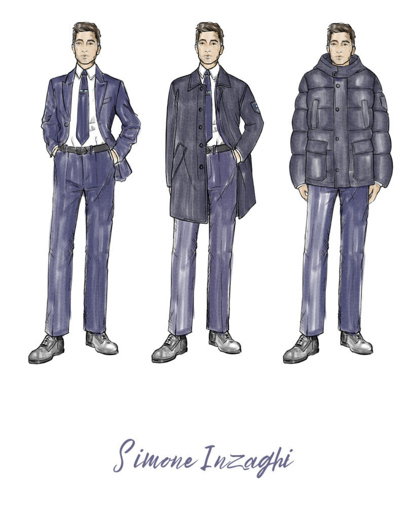 L’allenatore Simone Inzaghi, il Management e lo staff del Club vestiranno invece un completo di lana Impeccabile con camicia, pullover di lana merino e cravatta di seta jacquard. Insieme, un soprabito imbottito tre quarti di nylon soft touch. Il logo Canali e lo stemma dell’Inter sono combinati all’interno della freccia, segno grafico del brand maschile, appositamente ridisegnata e adattata alle colorazioni dei capi come una patch sempre visibile, ma mai invadente.