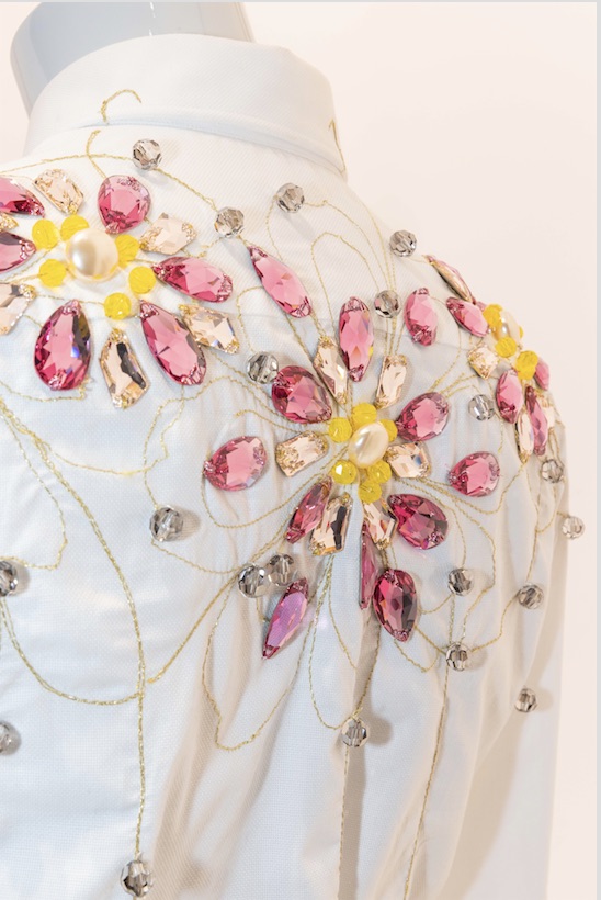 L’obiettivo era reinterpretare il tema del giardino incantato personalizzando una camicia genderless con la ricamatura dei celebri cristalli Swarovski di differenti forme, colori e dimensioni