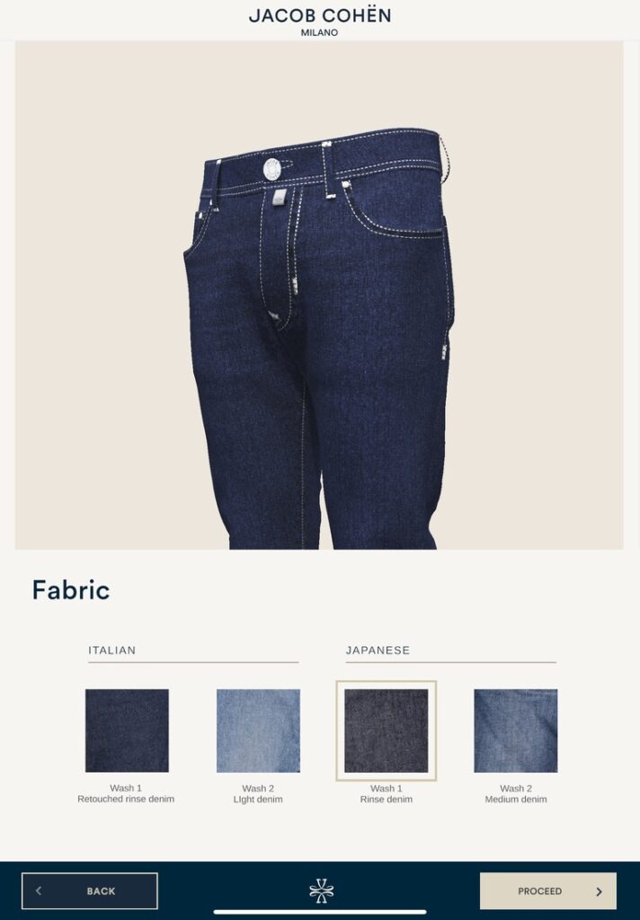 Partendo dall’iconico modello di denim di Jacob Cohën, ogni fase del processo diventa un gesto di stile, guidata da un’app dedicata e dal savoir-faire di personale specializzato. Il percorso inizia con la scelta del lavaggio e della tela, fino ad arrivare alla personalizzazione dei ricami, la scelta del bottone gioello e della salpa. È infine possibile incidere il proprio nome, trasformando ogni creazione in un segno distintivo di identità.