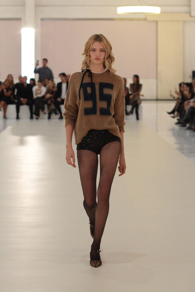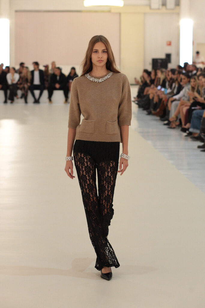 La maglieria è un abbraccio rassicurante: dai completi tricot ai grossi pullover mescolati con denim ed eco-pelliccia: ogni pezzo è un inno alla versatilità e al comfort. I tessuti, multimaterici, si rincorrono in delicate composizioni. Il raso illumina le proposte per il giorno e la sera, creando un’armonia tattile di colori che vanno dal pesca al beige fino al nero. Le sottovesti intime e sensuali, impreziosite da inserti in pizzo, scivolano morbide sotto maglie di lana mohair che cadono sulle spalle con nonchalance.