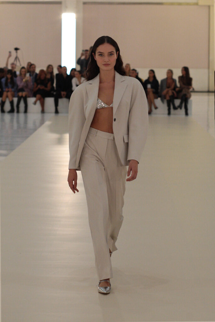 Il must-have della stagione? Il suit, declinato in innumerevoli varianti di forma, tessuto e volume. I pantaloni a palazzo si combinano con gilet affusolati e giacche oversize, donando alle donne una presenza scenica forte e decisa. I colori, naturali e sofisticati, sono esaltati da tocchi di glitter e paillettes che riflettono la luce in modo sottile e seducente. Il protagonista indiscusso è il burgundy, nuance profonda e vellutata che avvolge l’intera collezione.