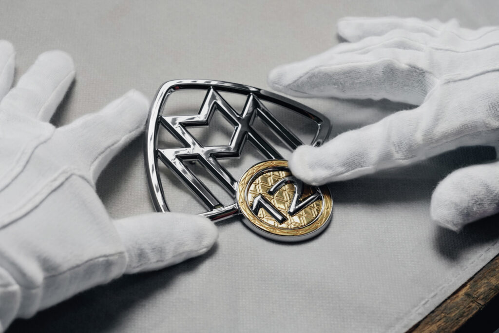 La Mercedes-Maybach V12 Edition prosegue anche l’eredità del marchio nel lavoro artigianale legato alla personalizzazione attraverso l’esclusivo programma MANUFAKTUR. Una verniciatura esterna bicolore – MANUFAKTUR verde oliva metallizzato sulla parte superiore della carrozzeria e nero ossidiana metallizzato sulla parte inferiore, accentuata da un gessato metallizzato argento high-tech a contrasto – sottolinea il carattere unico del veicolo. L’applicazione di questa verniciatura deve essere eseguita con meticolosa cura e può richiedere fino a 10 giorni lavorativi, il doppio del tempo necessario per la consueta verniciatura bicolore firmata Maybach. I cerchi forgiati a 5 fori in MANUFAKTUR verde oliva metallizzato completano il design, mentre lo specifico emblema Maybach sul montante C aggiunge un altro tocco di esclusività: il logo Maybach a doppia M è completato da una medaglia cromata e dorata, con un prominente “12” come tributo al leggendario ornamento del cofano della Maybach Zeppelin DS 8. L’anello della medaglia in oro 24 carati è ornato da una delicata incisione a diamante in una divisione ad anello in 12 parti. L’intarsio della medaglia, anch’esso realizzato in oro 24 carati, presenta una raffinata incisione a motivo a V, ispirata alla disposizione dei cilindri del motore.