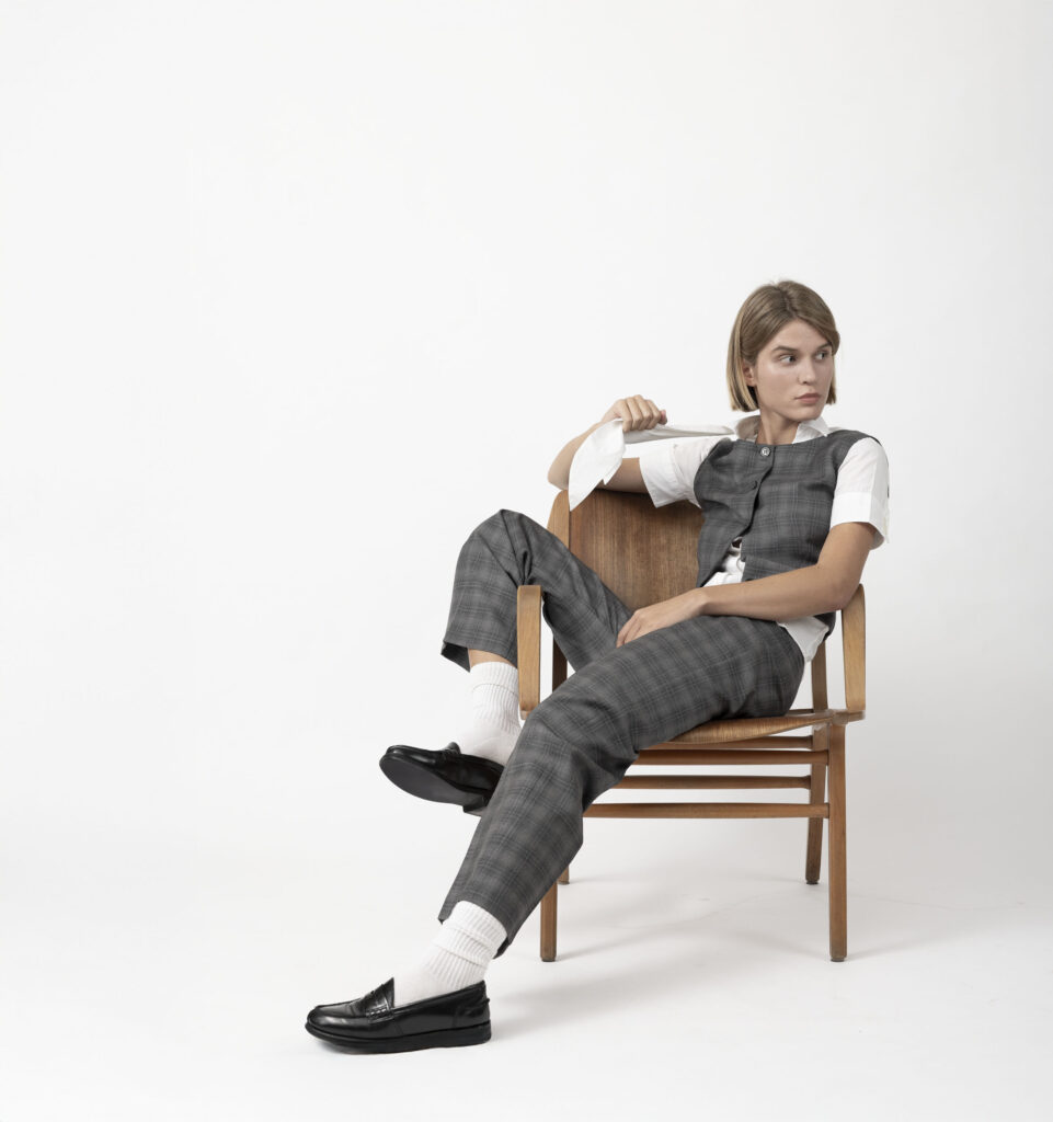 La palette cromatica privilegia tonalità fredde e sofisticate, spaziando dal grigio ghiaccio fino a fantasie bluette più vibranti. I tessuti, 100% lana provenienti da scarti di magazzino di grandi produttori dell’industria fashion, vengono recuperati e reinterpretati.