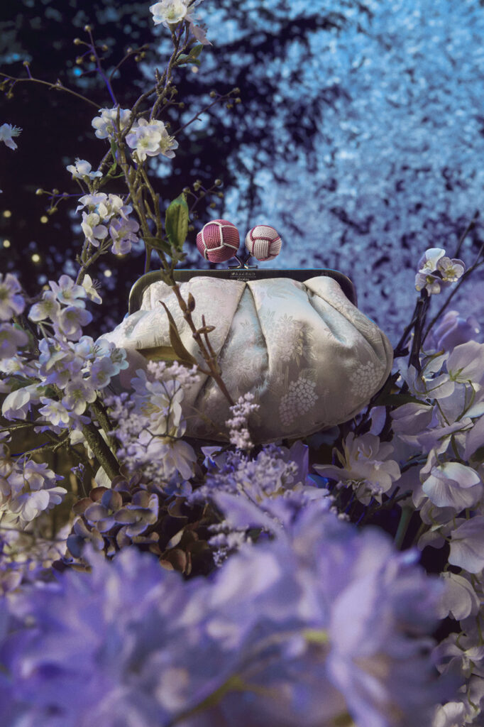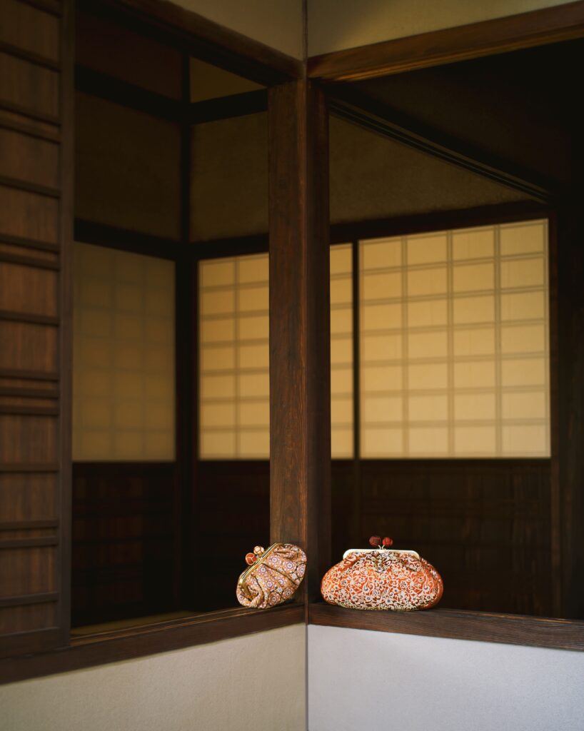 Le borse di questa special edition sono disponibili in sei varianti colore e in due dimensioni, ognuna avvolta nei preziosi jacquard in seta provenienti dagli archivi storici della Kawashima Selkon Textiles: una celebre azienda di tessuti con sede a Kyoto, che dal 1843 confeziona obi, abiti tradizionali e raffinate tappezzerie, combinando il know-how dei suoi artigiani certificati con tecniche tradizionali e tecnologie innovative.Le sfere della chiusura a boule sono realizzate a mano dagli artigiani della Bottega Nakamori-Kumihimo che dal 1927 produce obijime e cordoncini haori.