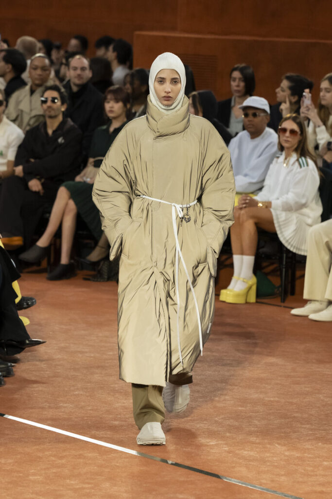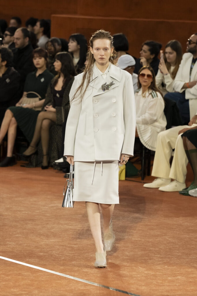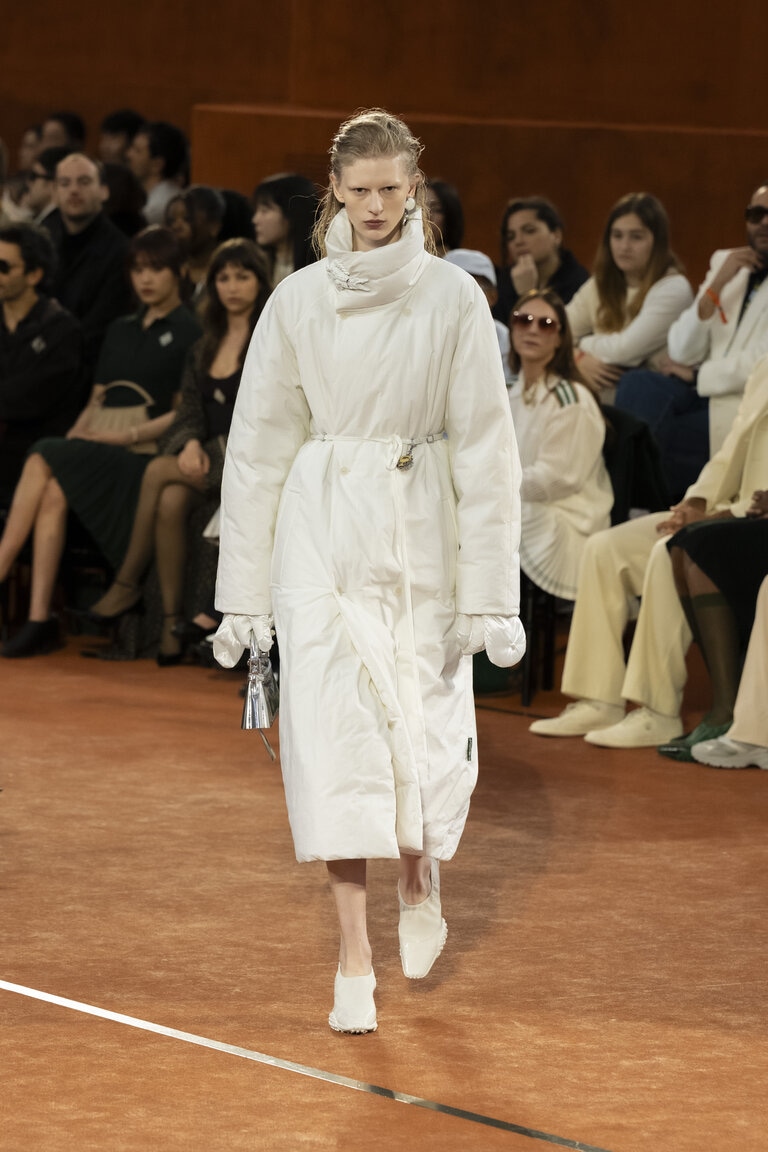 Forme e texture favoriscono la versatilità e la raffinatezza nonchalant. I tessuti performanti fanno compagnia a materiali nobili e a decorazioni selezionate ispirate al tennis per la sera, come il tweed bouclé, le maglie lucenti e gli intricati ricami degli atelier Safrane. I look chiave includono sensuali silhouette dalla linea ad A e raffinate maglie double-face abbinate ad abiti e gonne plissettati ad arte per lei, o a pantaloni fluidi a gamba larga con accenti di colore a contrasto per lui. I capispalla elevati, tra cui lussuosi cappotti in lana, trench tecnici dalla linea ad A con tessuto a membrana in lana e tute da ginnastica modernizzate, sono una dichiarazione di raffinatezza e comfort. L’iconica polo Lacoste viene reinventata, modificata e allungata in abiti, o rivisitata in maglieria strutturata e pezzi ibridi progettati per essere indossati a strati. Lane dalla texture ricca e morbidi cachemire si combinano con materiali performanti come il nylon tecnico riflettente, enfatizzando il comfort e lo sport. I capi di questa stagione sono punteggiati da reinterpretazioni del nome di René come logo. Le toppe gioiello ricamate si ispirano ai medaglioni dei tornei dell’archivio personale del fondatore, con una racchetta da tennis, la Coppa Davis e il nome di René Lacoste. Anche la borsa Lenglen ritorna questa stagione, in nuove interpretazioni e dimensioni ispirate al movimento di una gonna da tennis a pieghe.