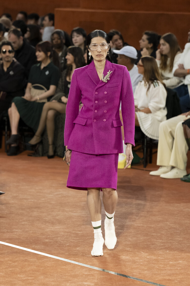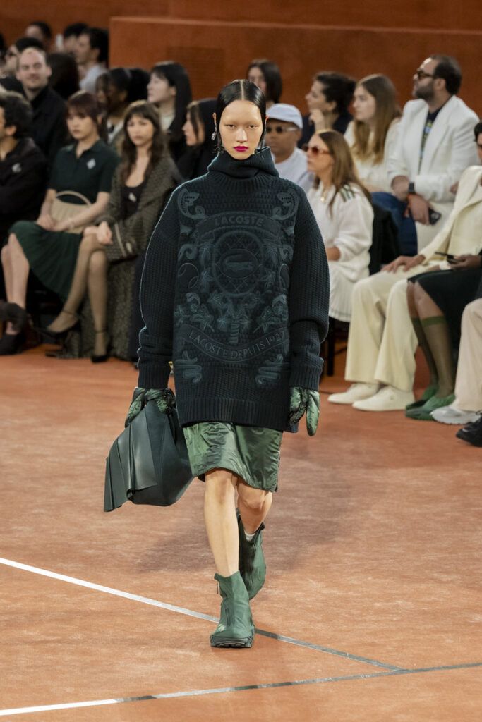 Trasformando l’iconico campo in terra battuta del Roland-Garros in un luogo di incontro intimo, la collezione e la scenografia per l’Autunno-Inverno 2025 evocano lo stile di vita colto ed elegante del “Coccodrillo”, passato da campione di tennis a sofisticato cittadino. Le silhouette pulite, grafiche e contemporanee passano con disinvoltura dalle ispirazioni sportive a un vortice sociale ispirato alla vita di René Lacoste negli anni Trenta, quando si intratteneva con atleti, attori, magnati industriali e grandi della moda dell’epoca. Oggi come allora, tutti coloro che contribuiscono a plasmare la cultura sono invitati a sedersi attorno al tavolo.