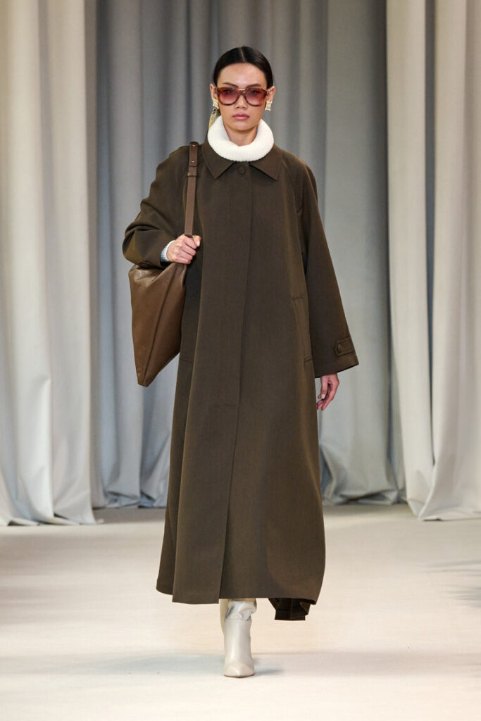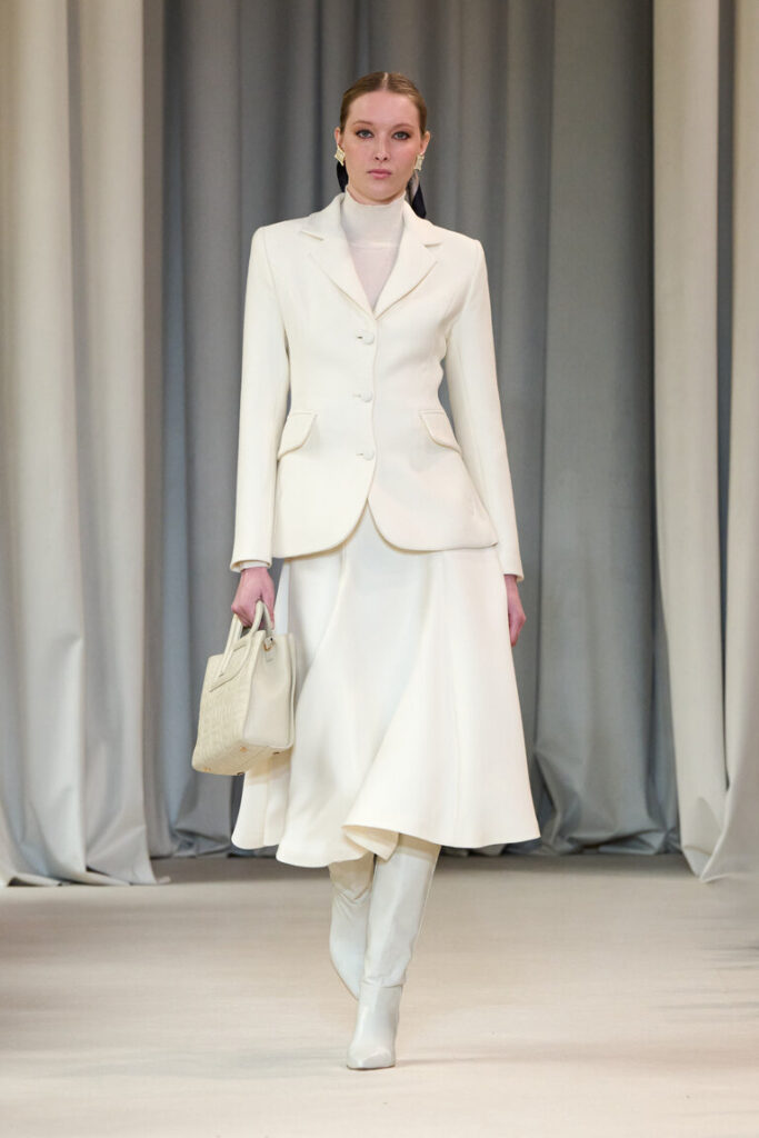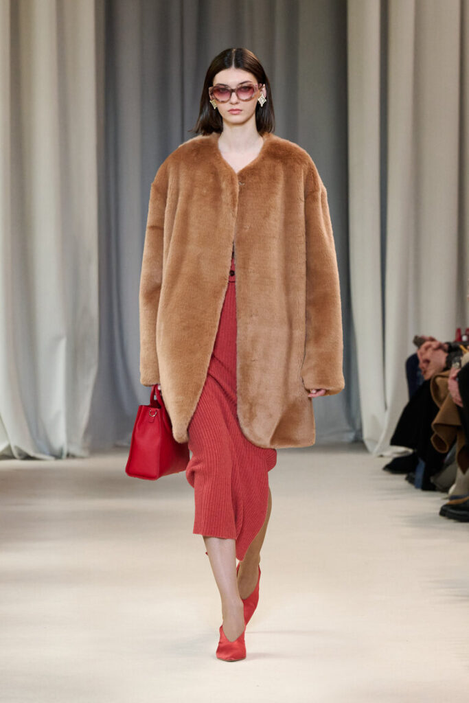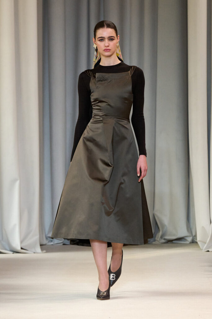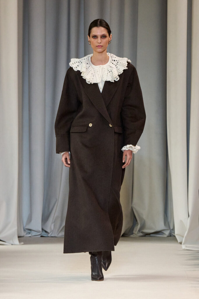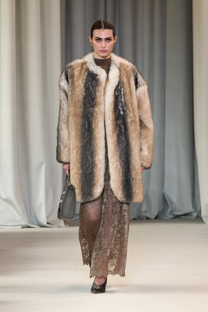 La sinfonia dei naturali va in un crescendo d’autunno per cappotti dagli ampi volumi, blazer che sottolineano il punto vita e gonne godet, in double. La stampa-cashmere, ripresa da un disegno acquerellato degli archivi, decora abiti in seta leggerissimi e fluttuanti, con le ali. Micro bagliori, che ricordano le luci del Piccolo Teatro, accendono la maglieria, il paisley diventa anche un inedito e prezioso ricamo fatto a mano. Lavorazioni couture per gli abiti in tessuto duchesse che si ispirano al principesco guardaroba di Cecilia Gallerani.