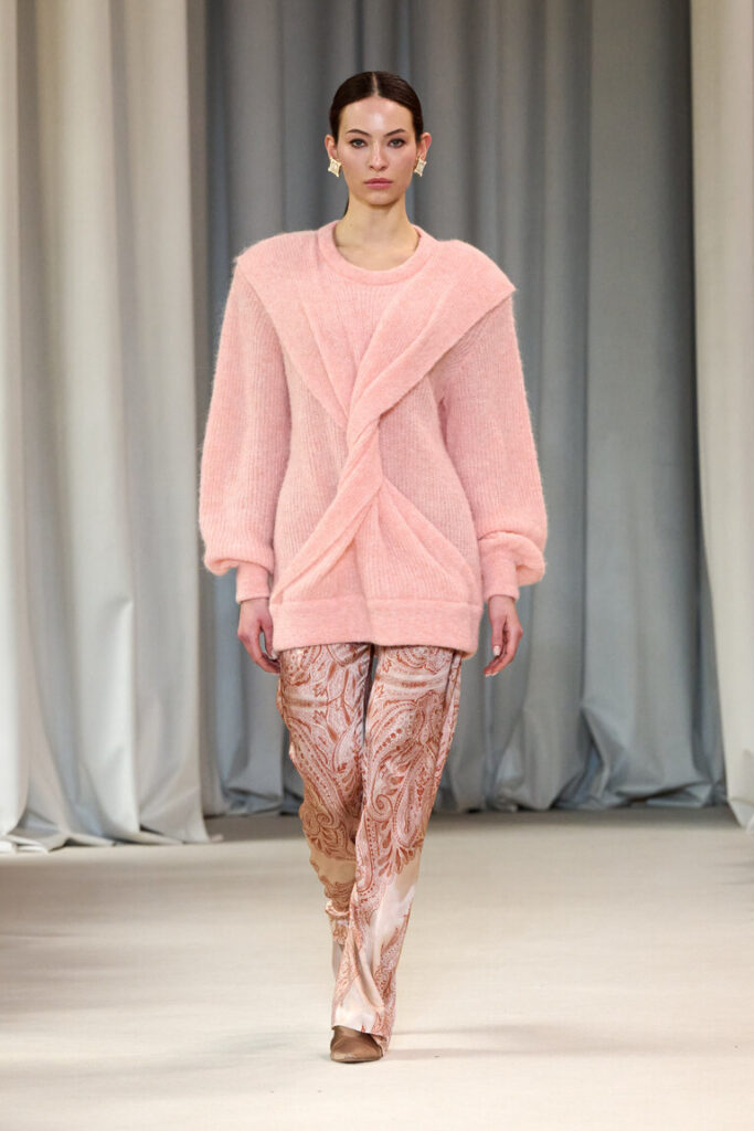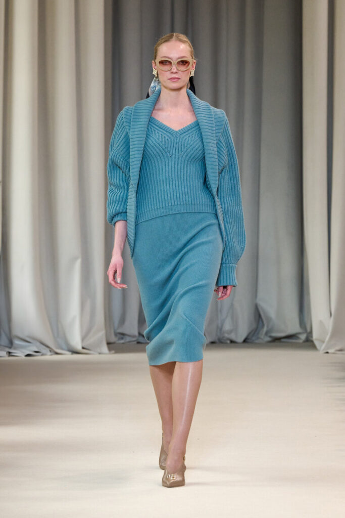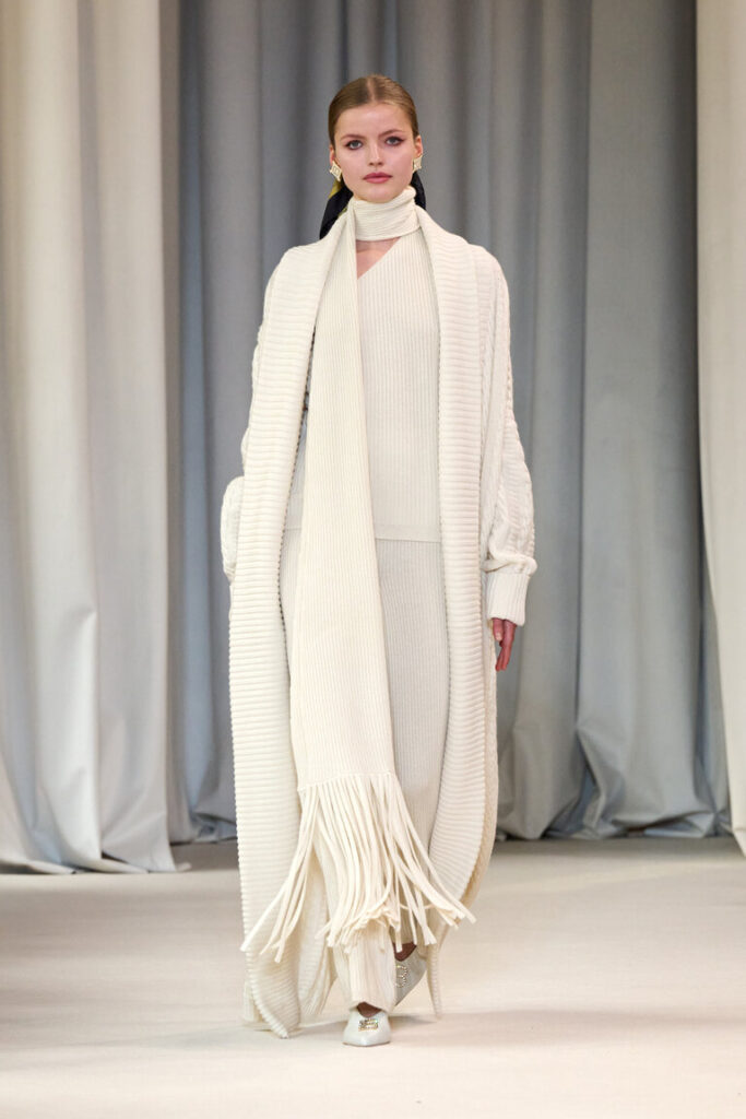 La collezione Laura Biagiotti Autunno Inverno 25/26 si intitola “Queen of Cashmere”, l’appellativo che Bernardine Morris, la mitica editorialista del New York Times, tributò a Laura e al marchio per l’eccellenza e le sperimentazioni nelle lavorazioni di questo filato. La collezione è frutto di un intenso processo di ricerca nelle forme e nella lavorazione di materiali pregiati, in particolare del cashmere, protagonista al “quadrato”: dalla stampa a motivo “paisley”, ai cappotti in cashmere double, ai ricami, fino naturalmente al filato prezioso declinato in innumerevoli versioni. Lo Jacquard effetto 3D con il lurex riproduce il disegno cashmere sull’iconico abito Bambola dai volumi avvolgenti. Le nuove coste vengono realizzate in molteplici filati: mohair, cashmere, cashmere e seta.