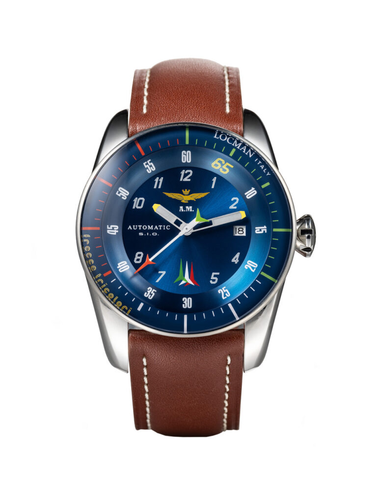 Un dettaglio distintivo è anche la sfera centrale dei secondi, a forma di freccia e impreziosita dai colori del Tricolore. Il quadrante blu sunray è racchiuso da un rehault con la minuteria, dove ai cinque minuti è riportato il numero 65, a celebrare la 65sima stagione acrobatica delle Frecce Tricolori. Al 12 campeggia l’Aquila Turrita, simbolo di tutti i piloti dell’Aeronautica Militare, e al 6 troviamo il logo della Pattuglia con le Tre Frecce, forti simboli di precisione e determinazione. L’ampio vetro curvo, su cui sono serigrafati gli indici dei secondi e la scritta Locman Italy, è fissato su una lunetta conica in acciaio satinato. L’ampia carrure lucida (44 mm), in acciaio inossidabile AISI e impermeabile fino a 10 Atmosfere, si caratterizzaper una forma ergonomica, che ne ottimizza la vestibilità.