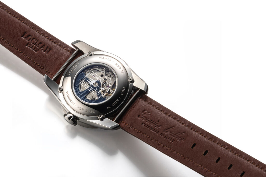 Sul fondo in titanio è incastonato un vetro minerale su cui è serigrafato il logo completo delle frecce tricolori, con le tre frecce e l’arco teso, e attraverso il quale si può ammirare il movimento automatico calibro SIO (Scuola Italiana di Orologeria), con la massa oscillante in tugsteno di colore blu che richiama la tonalità del quadrante.
